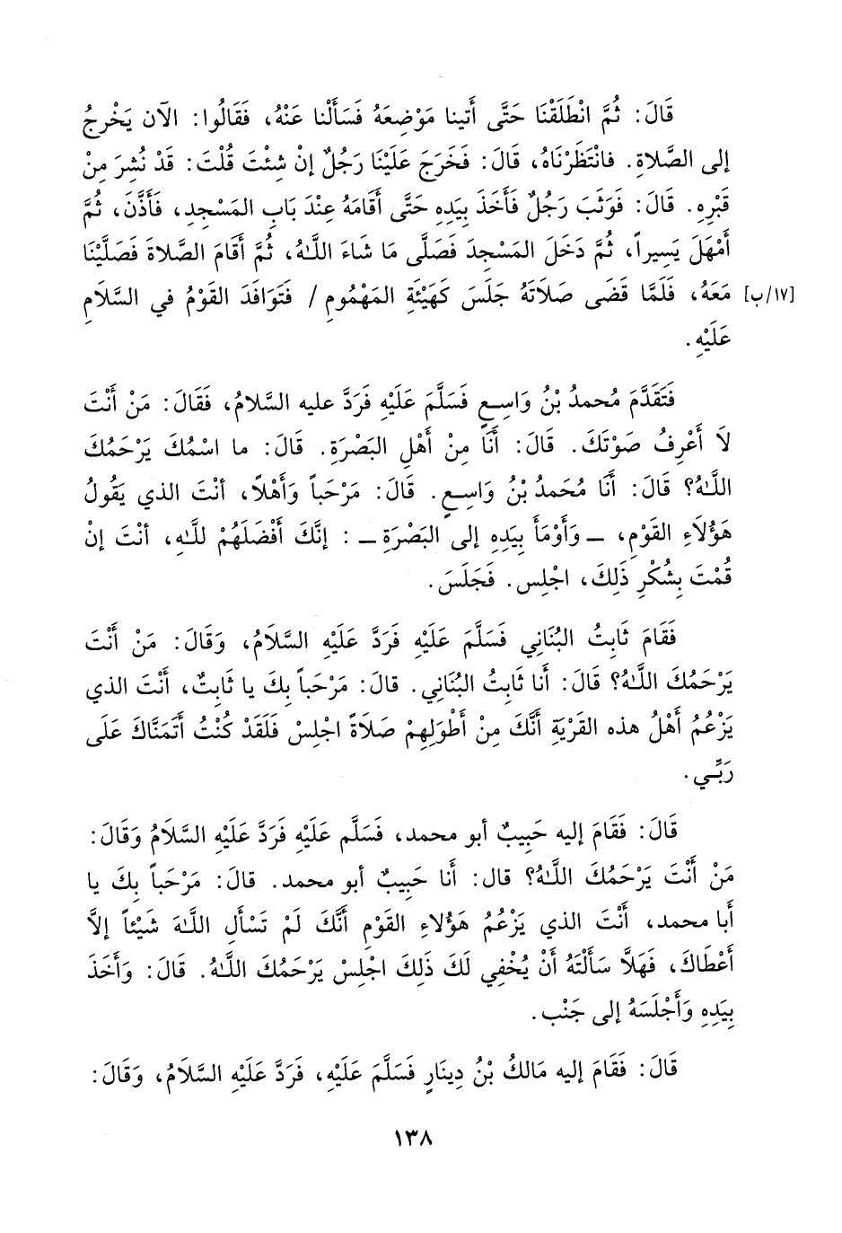 قَالَ: ثُمَّ انْطَلَقْنَا حَتَّى أَتَيْنَا مَوْضِعَهُ فَسَأَلْنَا عَنْهُ، فَقَالُوا: الْآنَ يَخْرُجُ إِلَى الصَّلَاةِ فَانْتَظَرْنَاهُ، قَالَ: فَخَرَجَ عَلَيْنَا رَجُلٌ إِنْ شِئْتَ قُلْتَ: قَدْ نُشِرَ مِنْ قَبْرِهِ قَالَ: فَوَثَبَ رَجُلٌ فَأَخَذَ بِيَدِهِ حَتَّى أَقَامَهُ عِنْدَ بَابِ الْمَسْجِدِ، فَأَذَّنَ، ثُمَّ أَمْهَلَ يَسِيرًا ثُمَّ دَخَلَ الْمَسْجِدَ فَصَلَّى مَا شَاءَ اللَّهُ، ثُمَّ أَقَامَ الصَّلَاةَ فَصَلَّيْنَا مَعَهُ، فَلَمَّا قَضَى صَلَاتَهُ جَلَسَ كَهَيْئَةِ الْمَهْمُومِ، فَتَوَافَدَ الْقَوْمُ فِي السَّلَامِ عَلَيْهِ، فَتَقَدَّمَ مُحَمدُ بْنُ وَاسِعٍ فَسَلَّمَ عَلَيْهِ فَرَدَّ عَلَيْهِ السَّلَامُ، فَقَالَ: مَنْ أَنْتَ لَا أَعْرِفُ صَوْتَكَ قَالَ: أَنَا مِنْ أَهْلِ الْبَصْرَةِ، قَالَ: مَا اسْمُكَ يَرْحَمُكَ اللَّهُ؟ قَالَ: أَنَا مُحَمدُ بْنُ وَاسِعٍ قَالَ: مَرْحَبًا وَأَهْلًا، أنْتَ الَّذِي يَقُولُ هَؤُلَاءِ الْقَوْمِ وَأَوْمَأَ بِيَدِهِ إِلَى الْبَصْرَةِ: إِنَّكَ أَفْضَلَهُمْ لِلَّهِ، أَنْتَ إِنْ قُمْتَ بِشُكْرِ ذَلِكَ، اجْلِسْ فَجَلَسَ فَقَامَ ثَابِتٌ الْبُنَانِيُّ، فَسَلَّمَ عَلَيْهِ، فَرَدَّ عَلَيْهِ السَّلَامُ، وَقَالَ مَنْ أَنْتَ يَرْحَمُكَ اللَّهُ؟ قَالَ: أَنَا ثَابِتٌ الْبُنَانِيُّ قَالَ: مَرْحَبًا بِكَ يَا ثَابِتٌ، أَنْتَ الَّذِي يَزْعُمُ أَهْلُ هَذِهِ الْقَرْيَةِ أَنَّكَ مِنْ أَطْوَلِهِمْ صَلَاةً، اجْلِسْ فَلَقَدْ كُنْتُ أَتَمَنَّاكَ عَلَى رَبِّي، قَالَ: فَقَامَ إِلَيْهِ حَبِيبٌ أَبُو مُحَمَّدٍ، فَسَلَّمَ عَلَيْهِ فَرَدَّ عَلَيْهِ السَّلَامُ، وَقَالَ: مَنْ أَنْتَ يَرْحَمُكَ اللَّهُ؟ قَالَ: أَنَا حَبِيبٌ أَبُو مُحَمَّدٍ، قَالَ: مَرْحَبًا بِكَ يَا أَبَا مُحَمَّدٍ، أَنْتَ الَّذِي يَزْعُمُ هَؤُلَاءِ الْقَوْمِ أَنَّكَ لَمْ تَسْأَلِ اللَّهَ شَيْئًا إِلَّا أَعْطَاكَ، فَهَلَّا سَأَلْتَهُ أَنْ يُخْفِي لَكَ ذَلِكَ، اجْلِسْ يَرْحَمُكَ اللَّهُ قَالَ: وَأَخَذَ بِيَدِهِ وَأَجْلَسَهُ إِلَى جَنْبٍ، قَالَ: فَقَامَ إِلَيْهِ مَالِكُ بْنُ دِينَارٍ فَسَلَّمَ عَلَيْهِ، فَرَدَّ عَلَيْهِ السَّلَامُ، وَقَالِ: