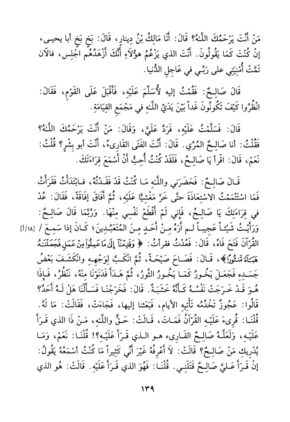 مَنْ أَنْتَ يَرْحَمُكَ اللَّهُ؟ قَالَ: أَنَا مَالِكُ بْنُ دِينَارٍ، قَالَ: بَخٍ بَخٍ أَبَا يَحْيَى، إِنْ كُنْتَ كَمَا يَقُولُونَ أَنْتَ الَّذِي يَزْعُمُ هَؤُلَاءِ أَنَّكَ أَزْهَدُهُمُ اجْلِسْ فَالْآنَ تَمَّتْ أُمْنِيَتِي عَلَى رَبِّي فِي عَاجِلِ الدَّنْيَا، قَالَ صَالِحٌ: فَقُمْتُ إِلَيْهِ لِأُسَلِّمَ عَلَيْهِ، فَأقْبَلَ عَلَى الْقَوْمِ، فَقَالَ: انْظُرُوا كَيْفَ تَكُونُونَ غَدًا بَيْنَ يَدَيِّ اللَّهِ فِي مَجْمَعِ الْقِيَامَةِ، قَالَ: فَسَلَّمْتُ عَلَيْهِ، فَرَدَّ عَلَيَّ، وَقَالَ: مَنْ أَنْتَ يَرْحَمُكَ اللَّهُ؟ فَقُلْتُ: أَنَا صَالِحٌ المُرِّيُّ، قَالَ: أَنْتَ الْفَتَى الْقَارِئُ، أَنْتَ أَبُو بِشْرٍ؟ قَلْتُ: نَعَمْ، قَالَ: اقْرَأْ يَا صَالِحُ، فَلَقَدْ كُنْتُ أُحِبُّ أَنْ أَسْمَعَ قِرَاءَتَكَ قَالَ صَالِحٌ: فَحَضَرَنِي وَاللَّهِ مَا كُنْتُ قَدْ فَقَدْتُهُ، فابْتَدَأْتُ، فَقَرَأْتُ فَمَا اسْتَتْمَمْتُ الِاسْتِعَاذَةَ حتَّى خَرَّ مَغْشِيًّا عَلَيْهِ، ثُمَّ أَفَاقَ إِفَاقَةً، فَقَالَ: عُدْ فِي قِرَاءَتِكَ يَا صَالِحٌ، فَإِنِّي لَمْ أَقْطَعْ نَفْسِي مِنْهَا وَرُبَّمَا قَالَ صَالِحٌ: وَرَأَيْتُ شَيْئًا عَجِيبًا لَمْ أَرَهُ مِنْ أَحَدِ الْمُتَعَبِّدِينَ، كَانَ إِذَا سَمِعَ الْقُرْآنَ فَتَحَ فَاهُ، قَالَ: فَعُدْتُ فَقَرَأْتُ: {وَقَدِمْنَا إِلَى مَا عَمِلُوا مِنْ عَمَلٍ فَجَعَلْنَاهُ هَبَاءً مَنْثُورًا} ، قَالَ: فَصَاحَ صَيْحَةً، ثُمَّ انْكَبَّ لِوَجْهِهِ وَانْكَشَفَ بَعْضُ جَسَدِهِ فَجَعَلَ يَخُورُ كَمَا يَخُورُ الثَّوْرُ، ثُمَّ هَدَأَ فَدَنَوْنَا مِنْهُ، نَنْظُرُ، فَإِذَا هُوَ قَدْ خَرَجَتْ نَفْسُهُ كَأَنَّهُ خَشَبَةٌ قَالَ: فَخَرَجْنَا فَسَأَلْنَا هَلْ لَهُ أَحَدٌ؟ قَالُوا: عَجُوزٌ تَخْدُمُهُ تَأْتِيهِ الْأَيَّامَ، فَبَعَثْنَا إِلَيْهَا، فَجَاءَتْ، فَقَالَتْ: مَا لَهُ قُلْنَا: قُرِئَ عَلَيْهِ الْقُرْآنُ فَمَاتَ، قَالَتْ: حَقٌّ وَاللَّهِ، مَنْ ذَا الَّذِي قَرَأَ عَلَيْهِ، وَلَعَلَّهُ صَالِحٌ الْقَارِئُ هُوَ الَّذِي قَرَأَ عَلَيْهِ؟ قُلْنَا: نَعَمْ، وَمَا يُدْرِيكِ مَنْ صَالِحٌ؟ قَالَتْ: لَا أَعْرِفُهُ غَيْرَ أَنِّي كَثِيرًا مَا كُنْتُ أَسْمَعُهُ يَقُولُ: إِنْ قَرَأَ عَلَيَّ صَالِحٌ قَتَلَنِي قُلْنَا: فَهُوَ الَّذِي قَرَأَ عَلَيْهِ قَالَتْ: هُوَ الَّذِي