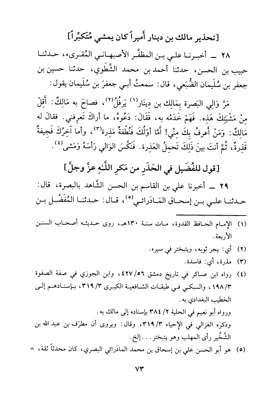 28 - أَخْبَرَنَا عَلِيُّ بْنُ الْمُظَفَّرِ الْأَصْبَهَانِيُّ الْمُقْرِئُ، حَدَّثَنَا حَبِيبُ بْنُ الْحَسَنِ، حَدَّثَنَا أَحْمَدُ بْنُ مُحَمَّدٍ الشَّطَوِيُّ، حَدَّثَنَا حُسَيْنُ بْنُ جَعْفَرِ بْنِ سُلَيْمَانَ الضُّبَعِيُّ، قَالَ: سَمِعْتُ أَبِي جَعْفرَ بْنَ سُلَيْمَانَ، يَقُولُ: مَرَّ وَالِي الْبَصْرَةِ بِمَالِكِ بْنِ دِينَارٍ يَرْفُلُ، فَصَاحَ بِهِ مَالِكٌ: " أَقِلَّ مِنْ مَشْيَتِكَ هَذِهِ " فَهَمَّ خَدَمُهُ بِهِ، فَقَالَ: دَعُوهُ، مَا أَرَاكَ تَعْرِفُنِي فَقَالَ لَهُ مَالِكٌ: " وَمَنْ أَعْرَفُ بِكَ مِنِّي أَمَّا أَوَّلُكَ فَنُطْفَةٌ مَذِرَةٌ، وَأَمَّا آخِرُكَ فَجِيفةٌ قَذِرَةٌ، ثُمَّ أَنْتَ بَيْنَ ذَلِكَ تَحْمِلُ الْعَذِرَةَ " فَنَكَّسَ الوَالِي رَأسَهُ وَمَشَى