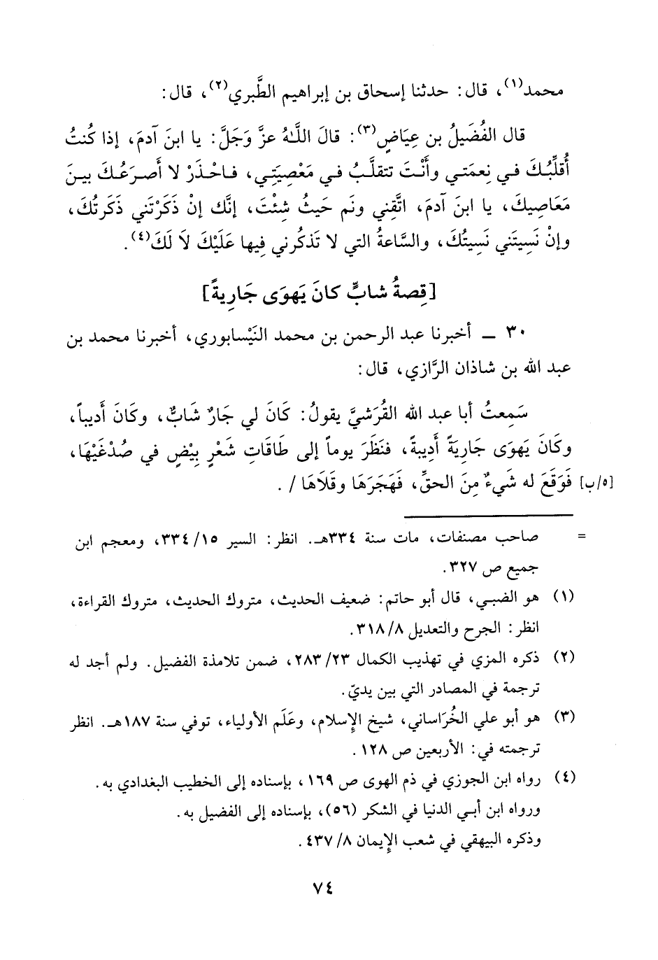 30 - أَخْبَرَنَا عَبْدُ الرَّحْمَنِ بْنِ مُحَمَّدٍ النَّيْسَابُورِيُّ، أَخْبَرَنَا مُحَمَّدُ بْنُ عَبْدِ اللَّهِ بْنِ شَاذَانَ الرَّازِيُّ، قَالَ: سَمِعْتُ أَبَا عَبْدِ اللَّهِ الْقُرَشِيَّ، يَقُولُ: " كَانَ لِي جَارٌ شَابٌّ، وَكَانَ أَدِيبًا، وَكَانَ يَهْوَى جَارِيَةً أَدِيبَةً، فَنَظَرَ يَوْمًا إِلَى طَاقَاتِ شَعْرٍ بِيضٍ فِي صُدْغَيْهَا، فَوَقَعَ لَهُ شَيْءٌ مِنَ الْحَقِّ، فَهَجَرَهَا وَقَلَاهَا،