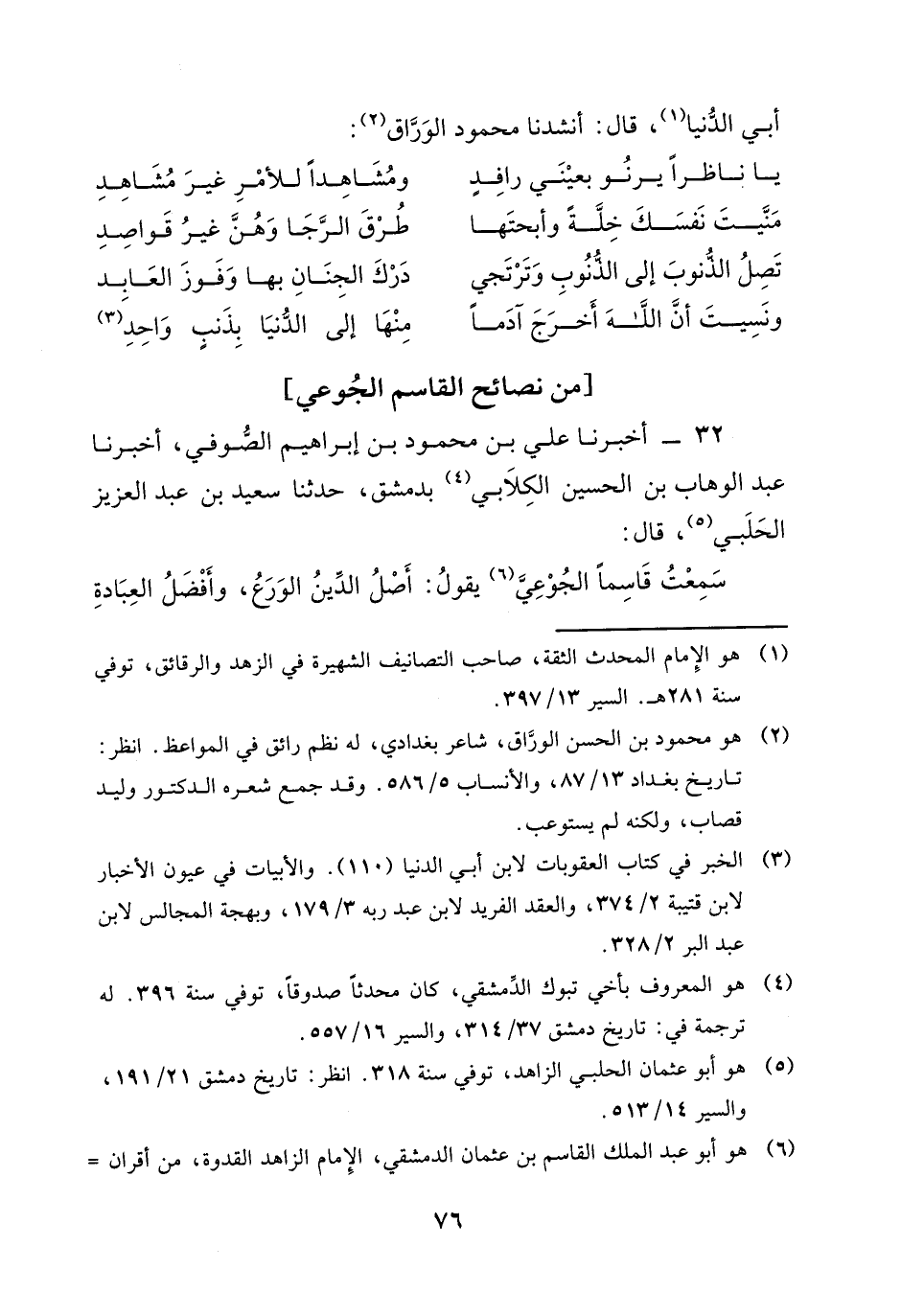 32 - أَخْبَرَنَا عَلِيُّ بْنُ مَحْمُودِ بْنِ إِبْرَاهِيمَ الصُّوفِيُّ، أَخْبَرَنَا عَبْدُ الْوَهَّابِ بْنُ الْحُسَيْنِ الْكِلَابِيُّ، بِدِمَشْقَ، حَدَّثَنَا سَعِيدُ بْنُ عَبْدِ الْعَزِيزِ الْحَلَبِيُّ، قَالَ: سَمِعْتُ قَاسِمًا الْجُوَعِيَّ، يَقُولُ: " أَصْلُ الدِّينِ الْوَرَعُ، وَأَفْضَلُ الْعِبَادَةِ