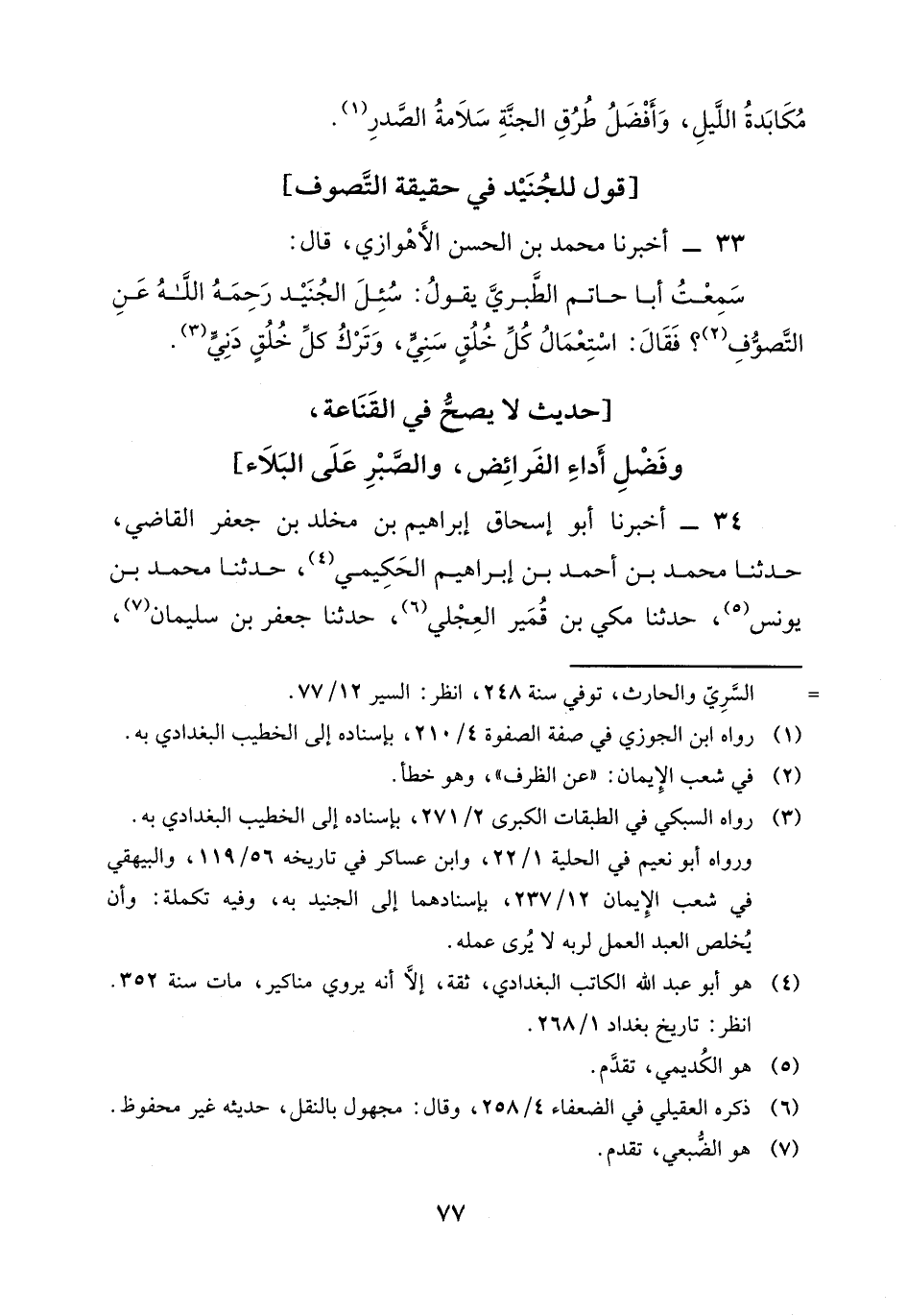 33 - أَخْبَرَنَا مُحَمَّدُ بْنُ الْحَسَنِ الْأَهْوَازِيُّ، قَالَ: سَمِعْتُ أَبَا حَاتِمٍ الطَّبَرِيَّ، يَقُولُ: سُئِلَ الْجُنَيْدُ رَحِمَهُ اللَّهُ عَنِ التَّصَوُّفِ؟ فَقَالَ: " اسْتِعْمَالُ كُلِّ خُلُقٍ سَنِيٍّ، وَتَرْكُ كُلِّ خُلُقٍ دَنِيٍّ "
