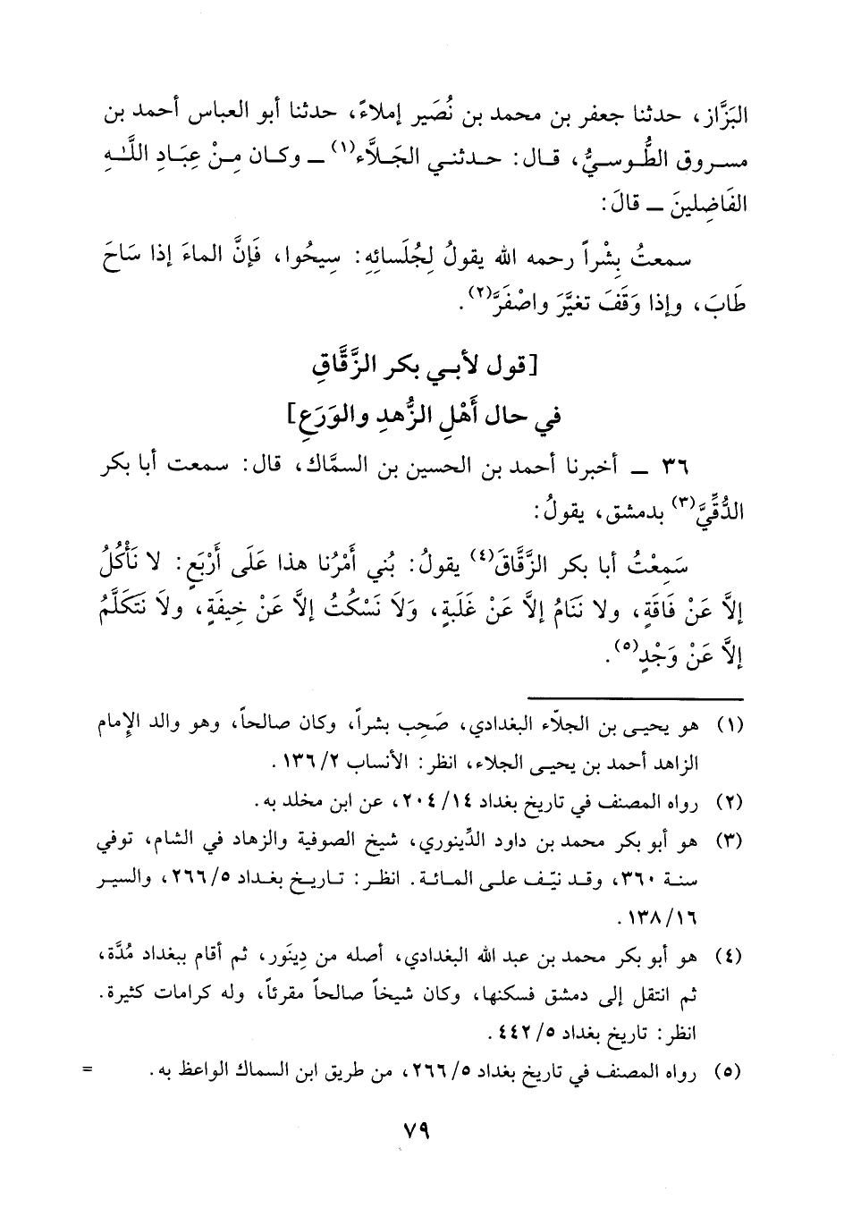 36 - أَخْبَرَنَا أَحْمَدُ بْنُ الْحُسَيْنِ بْنِ السَّمَّاكِ، قَالَ: سَمِعْتُ أَبَا بَكْرٍ الدُّقِّيَّ، بِدِمَشْقَ يَقُولُ: سَمِعْتُ أَبَا بَكْرٍ الزَّقَّاقَ، يَقُولُ: " بُنِيَ أَمْرُنَا هَذَا عَلَى أَرْبَعٍ: لَا نَأْكُلُ إِلَّا عَنْ فَاقَةٍ، وَلَا نَنَامُ إِلَّا عَنْ غَلَبَةٍ، وَلَا نَسْكُتُ إلا عَنْ خِيفَةٍ، وَلَا نَتَكلَّمُ إلَّا عَنْ وَجْدٍ "