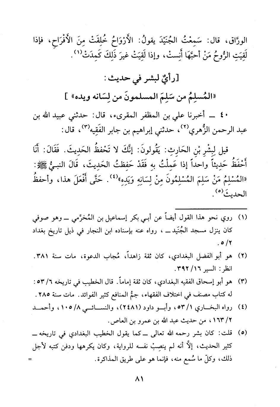 40 - أَخْبَرَنَا عَلِيُّ بْنُ الْمُظَفَّرِ الْمُقْرِئُ، قَالَ: حَدَّثَنِي عُبَيْدُ اللَّهِ بْنُ عَبْدِ الرَّحْمَنِ الزُّهْرِيُّ، حَدَّثَنِي إِبْرَاهِيمُ بْنُ جَابِرٍ الْفَقِيهُ، قَالَ: قِيلَ لِبِشْرِ بْنِ الْحَارِثِ: يَقُولُونَ: إِنَّكَ لَا تَحْفَظُ الْحَدِيثَ فَقَالَ: " أَنَا أَحْفَظُ حَدِيثًا وَاحِدًا، إِذَا عَمِلْتُ بِهِ فَقَدْ حَفِظْتُ الْحَدِيثَ، قَالَ النَّبِيُّ صَلَّى اللَّهُ عَلَيْهِ وَسَلَّمَ: الْمُسْلِمُ مَنْ سَلِمَ الْمُسْلِمُونَ مِنْ لِسَانِهِ وَيَدِهِ، حَتَّى أَفْعَلَ هَذَا وَأَحَفَظَ الْحَدِيثَ "