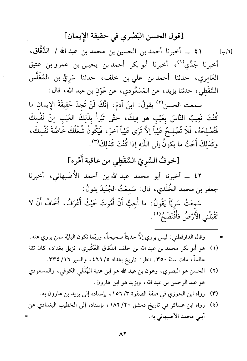 41 - أَخْبَرَنَا أَحْمَدُ بْنُ الْحُسَيْنِ بْنِ مُحَمَّدِ بْنِ عَبْدِ اللَّهِ الدَّقَّاقُ، أَخْبَرَنَا جَدِّي، أَخْبَرَنَا أَبُو بَكْرٍ أَحْمَدُ بْنُ يَحْيَى بْنِ عَمْرِو بْنِ عَتِيقٍ الْعَامِرِيُّ، حَدَّثَنَا أَحْمَدُ بْنُ عَلِيِّ بْنِ خَلَفٍ، حَدَّثَنَا سَرِيُّ بْنُ الْمُغَلَّسِ السَّقَطِيُّ، حَدَّثَنَا يَزِيدُ، عَنِ الْمَسْعُودِيِّ، عَنْ عَوْنِ بْنِ عَبْدِ اللَّهِ، قَالَ: سَمِعْتُ الْحَسَنَ، يَقُولُ: " ابْنَ آدَمَ، إِنَّكَ لَنْ تَجِدَ حَقِيقَةَ الْإِيمَانِ مَا كُنْتَ تَعِيبُ النَّاسَ بِعَيْبٍ هُوَ فِيكَ، حَتَّى تَبْرَأَ بِذَلِكَ الْعَيْبِ مِنْ نَفْسِكَ فَتُصْلِحَهُ، فَلَا تَصْلِحُ عَيْبًا إِلَّا تَرَى عَيْبًا آخَرَ، فَيَكُونُ شُغْلُكَ خَاصَّةَ نَفْسِكَ، وَكَذَلِكَ أَحَبَّ مَا يَكُونُ إِلَى اللَّهِ إِذَا كُنْتَ كَذَلِكَ "