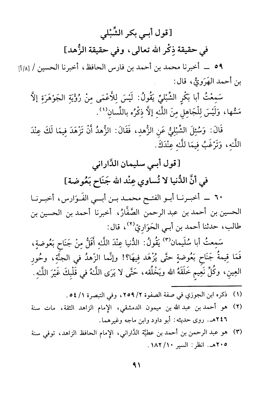 59 - أَخْبَرَنَا مُحَمَّدُ بْنُ أَحْمَدَ بْنِ فَارِسٍ الْحَافِظُ، أَخْبَرَنَا الْحُسَيْنُ بْنُ أَحْمَدَ الْهَرَوِيُّ، قَالَ: سَمِعْتُ أَبَا بَكْرٍ الشِّبْليَّ، يَقُولُ: " لَيْسَ لِلْأَعْمَى مِنْ رُؤْيَةِ الْجَوْهَرَةِ إِلَّا مَسُّهَا، وَلَيْسَ لِلْجَاهِلِ مِنَ اللَّهِ إِلَّا ذِكْرُهُ بِاللِّسَانِ " قَالَ: وَسُئِلَ الشِّبْليُّ عَنِ الزُّهْدِ، فَقَالَ: " الزُّهْدُ أَنْ تَزْهَدَ فِيمَا لَكَ عِنْدَ اللَّهِ، وَتَرْغَبَ فِيمَا لِلَّهِ عِنْدَكَ "