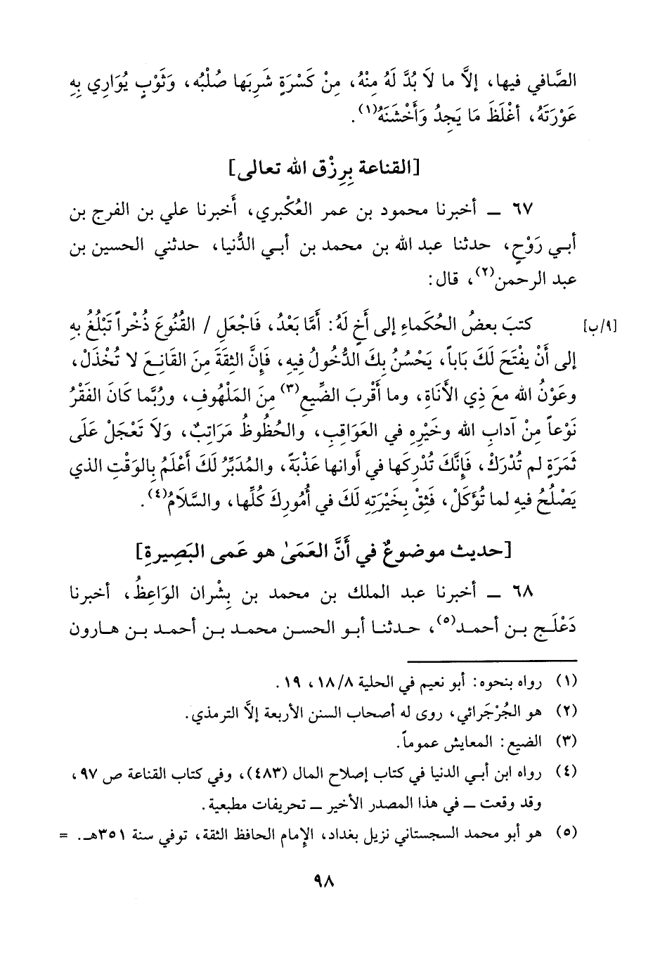 67 - أَخْبَرَنَا مَحْمُودُ بْنُ عُمَرَ الْعُكْبَرِيُّ، أَخْبَرَنَا عَلِيُّ بْنُ الْفَرَجِ بْنِ أَبِي رَوْحٍ، حَدَّثَنَا عَبْدُ اللَّهِ بْنُ مُحَمَّدِ بْنِ أَبِي الدُّنْيَا، حَدَّثَنِي الْحُسَيْنُ بْنُ عَبْدِ الرَّحْمَنِ، قَالَ: كَتَبَ بَعْضُ الْحُكَمَاءِ إِلَى أَخٍ لَهُ: أَمَّا بَعْدُ، فَأجْعَلِ الْقُنُوعَ ذُخْرًا تَبْلُغُ بِهِ إِلَى أَنْ يُفْتَحَ لَكَ بَابًا، يَحْسُنُ بِكَ الدَّخُولُ فِيهِ، فَإِنَّ الثِّقَةَ مِنَ الْقَانِعِ لَا تُخْذَلُ، وَعَوْنُ اللَّهِ مع ذي الأناة، وما أقرب الضيع من الملهوف، وربما كان الفقر نوعا من آداب الله، وخيره في العواقب، والحظوظ مراتب، ولا تعجل على ثمرة لم تدرك، فإنك تدركها في أوانها عذبة، والمدبر لك أعلم بالوقت الذي يصلح فيه لما تؤكل، فثق بخيرته لك في أمورك كلها، والسلام "