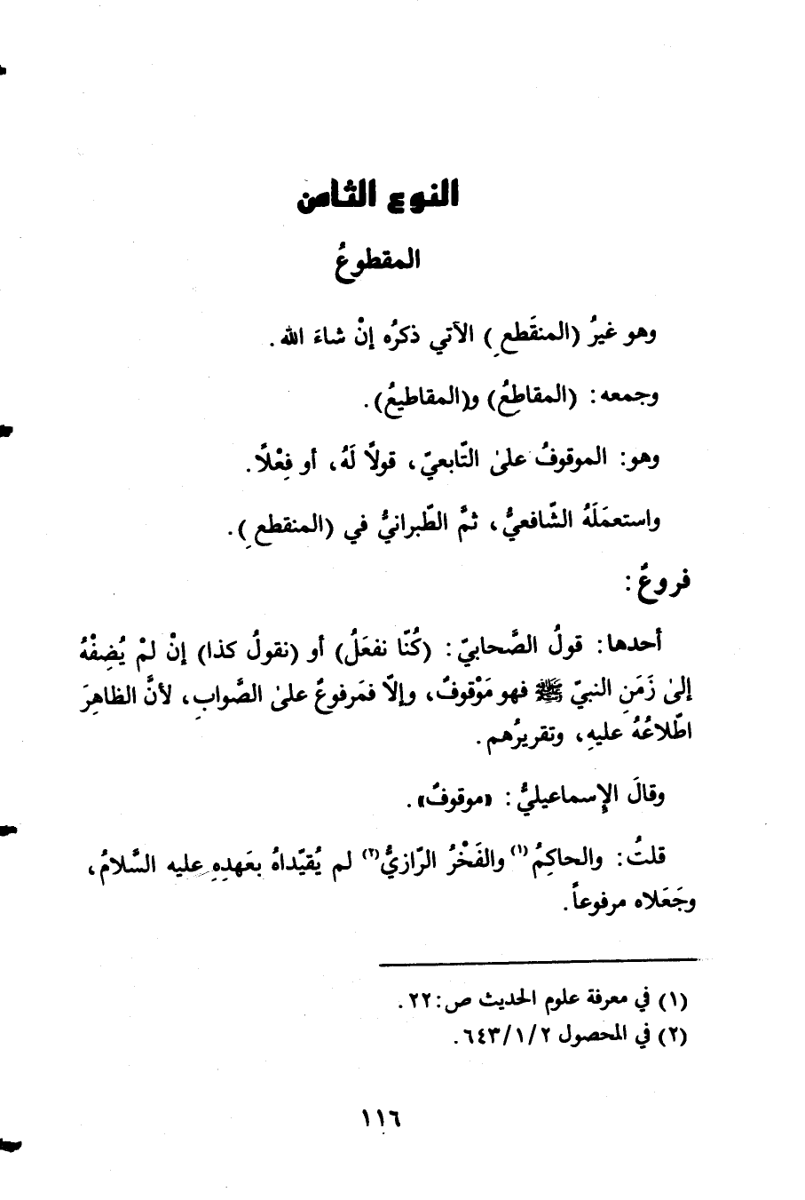 أَحدهمَا قَول الصَّحَابِيّ كُنَّا نَفْعل أَو كَذَا إِن لم يضفه إِلَى زمن النَّبِي 4 صلى الله عَلَيْهِ وَسلم فَهُوَ مَوْقُوف وَإِلَّا فمرفوع على الصَّوَاب لِأَن الظَّاهِر إطلاعه عَلَيْهِ وتقريرهم 5