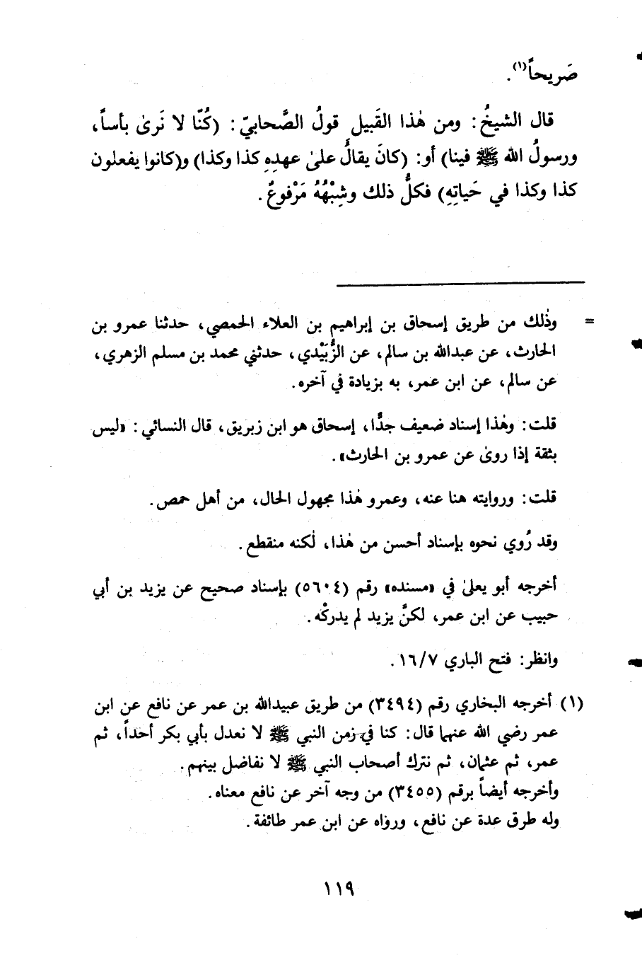 قَالَ الشَّيْخ وَمن هَذَا الْقَبِيل قَول الصَّحَابِيّ كُنَّا لَا نرى بَأْسا وَرَسُول الله صلى 2 الله عَلَيْهِ وَسلم فِينَا أَو كَانَ يُقَال على عَهده كَذَا وَكَذَا وَكَانُوا يَفْعَلُونَ كَذَا وَكَذَا فِي حَيَاته 3 فَكل ذَلِك وَشبهه مَرْفُوع
