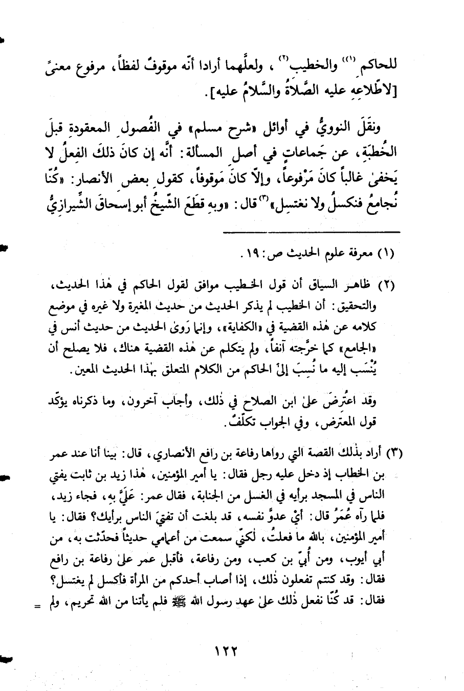 وَنقل النَّوَوِيّ فِي أَوَائِل شرح مُسلم فِي لفصول المعقودة قبل الْخطْبَة عَن جماعات 3 فِي أصل المسالة أَنه كَانَ ذَلِك الْفِعْل لَا يخفى غَالِبا كَانَ مَرْفُوعا وَإِلَّا كَانَ مَوْقُوفا كَقَوْل 4 بعض الْأَنْصَار كُنَّا نجامع فنكسل وَلَا نغتسل قَالَ وَبِه قطع الشَّيْخ أَبُو إِسْحَاق الشِّيرَازِيّ