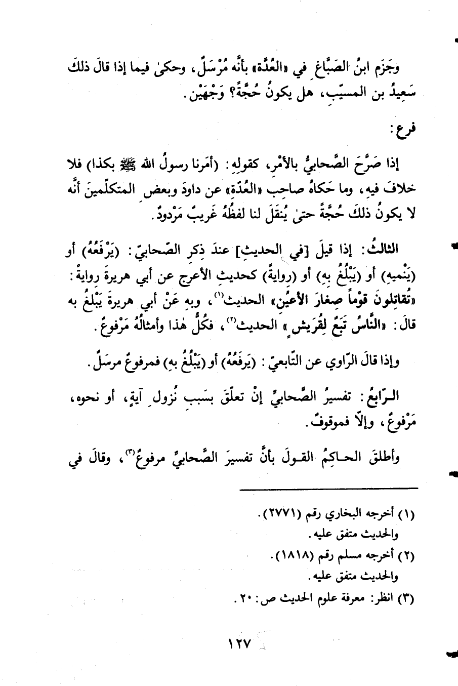 الثَّالِث إِذا قيل فِي الحَدِيث عِنْد ذكر الصَّحَابِيّ 5 يرفعهُ أَو ينميه أَو يبلغ بِهِ أَو رِوَايَة كَحَدِيث الْأَعْرَج عَن أبي هُرَيْرَة رِوَايَة تقاتلون قوما 6 صغَار الْأَعْين الحَدِيث وَبِه عَن أبي هُرَيْرَة يبلغ بِهِ قَالَ النَّاس تبع لقريش الحَدِيث فَكل هَذَا 7 وَأَمْثَاله مَرْفُوع