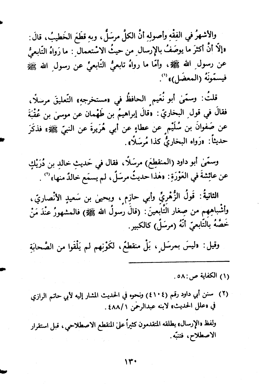 1 - وَالْأَشْهر فِي الْفِقْه وأصوله أَن الْكل مُرْسل وَبِه قطع الْخَطِيب قَالَ إِلَّا أَن أَكثر مَا يُوصف 2 بِالْإِرْسَال من حَيْثُ الِاسْتِعْمَال مَا رَوَاهُ التَّابِعِيّ عَن رَسُول الله صلى الله عَلَيْهِ وَسلم وَأما 3 مَا رَوَاهُ تَابِعِيّ التَّابِعِيّ عَن رَسُول اله صلى الله عَلَيْهِ وَسلم فيسمونه المعضل