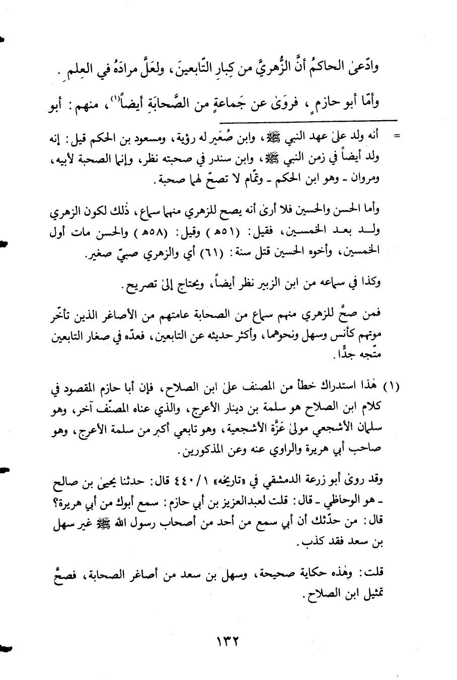 1 - وَادّعى الْحَاكِم أَن الزُّهْرِيّ من كبار التَّابِعين وَلَعَلَّ مُرَاده فِي الْعلم وَأما أَبُو حَازِم 2 فروى عَن جمَاعَة من الصَّحَابَة أَيْضا مِنْهُم أَبُو