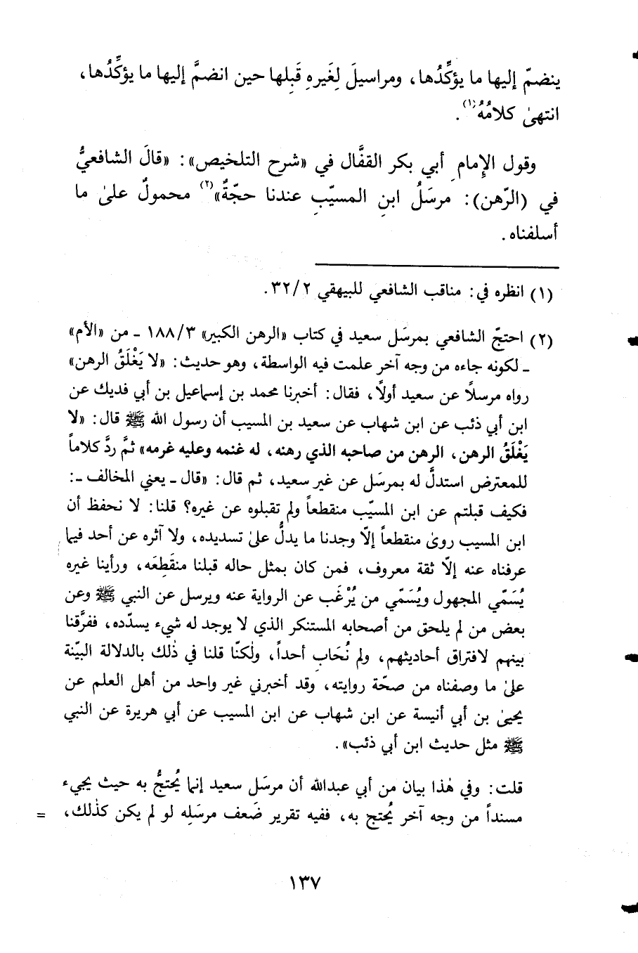 وَقَول الإِمَام أبي بكر الْقفال فِي شرح التَّلْخِيص قَالَ الشَّافِعِي فِي الرَّهْن مُرْسل ابْن 3 الْمسيب عندنَا حجَّة مَحْمُول على مَا أسلفناه