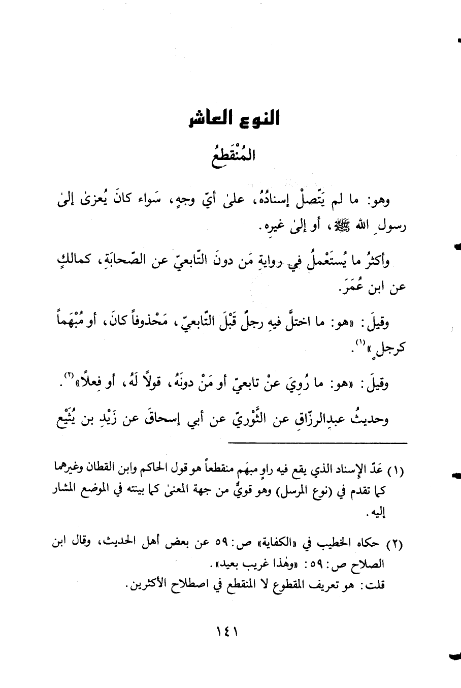 وَهُوَ مَا لم يتَّصل إِسْنَاده على أَي وَجه سَوَاء كَانَ يعزى إِلَى 2 رَسُول الله صلى الله عَلَيْهِ وَسلم أَو إِلَى غَيره