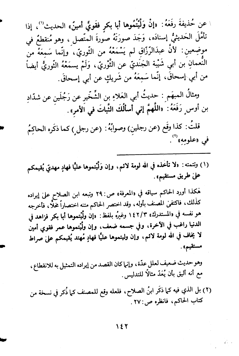 1 - عَن حُذَيْفَة رَفعه إِن وليتموها أَبَا بكر فقوي أَمِين الحَدِيث إِذا تَأمل الحديثي إِسْنَاده 2 وجد صورته صُورَة الْمُتَّصِل وَهُوَ مُنْقَطع فِي موضِعين لِأَن عبد الرَّزَّاق لم يسمعهُ من الثَّوْريّ وَإِنَّمَا 3 سَمعه من النُّعْمَان بن أبي شيبَة الجندي عَن الثَّوْريّ وَلم يسمعهُ الثَّوْريّ أَيْضا من أبي إِسْحَاق 4 إِنَّمَا سَمعه من شريك عَن أبي إِسْحَاق