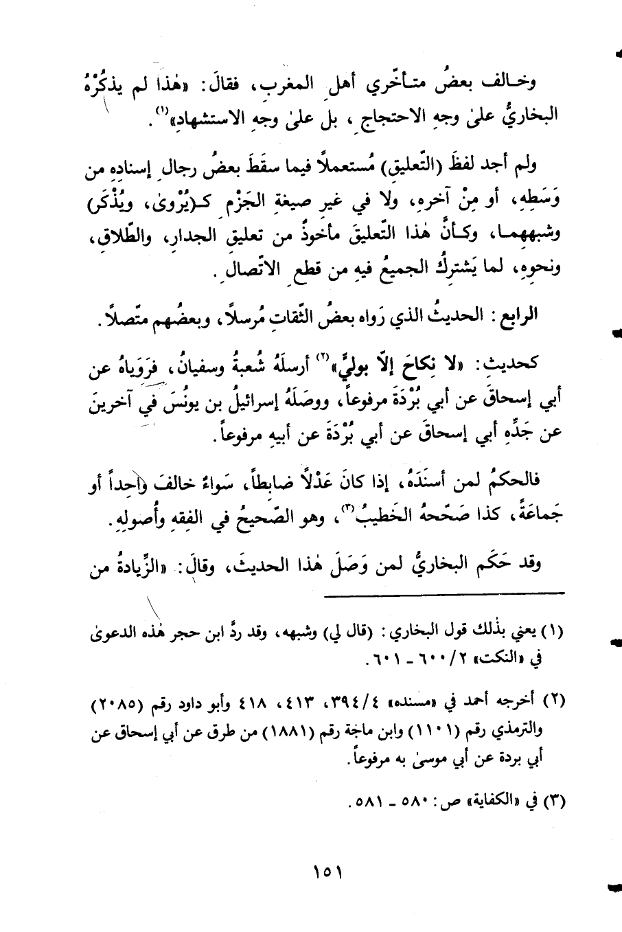 كَحَدِيث لَا نِكَاح إِلَّا بولِي أرْسلهُ شُعْبَة وسُفْيَان 6 فروياه عَن أبي إِسْحَاق عَن أبي بردة مَرْفُوعا وَوَصله إِسْرَائِيل بن يُونُس فِي آخَرين عَن جده 7 أبي إِسْحَاق عَن أبي بردة عَن أَبِيه مَرْفُوعا