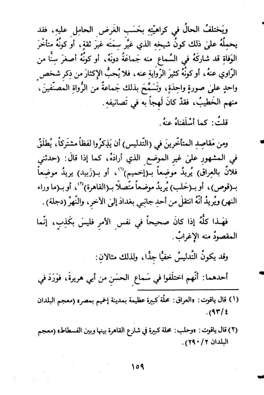 وَمن مَقَاصِد الْمُتَأَخِّرين فِي التَّدْلِيس أَن يذكرُوا 6 لفظا مُشْتَركا يُطلق فِي الْمَشْهُور على غير الْموضع الَّذِي أَرَادَهُ كَمَا إِذا قَالَ حَدثنِي فلَان 7 بالعراق يُرِيد ب إخيم أَو ب زبيد يُرِيد موضعا ب قوص أَو ب حلب يُرِيد موضعا مُتَّصِلا 8 ب الْقَاهِرَة أَو ب مَا وَرَاء النَّهر وَيُرِيد أَنه انْتقل من أحد جَانِبي بَغْدَاد إِلَى الآخر وَالنّهر 9 دجلة