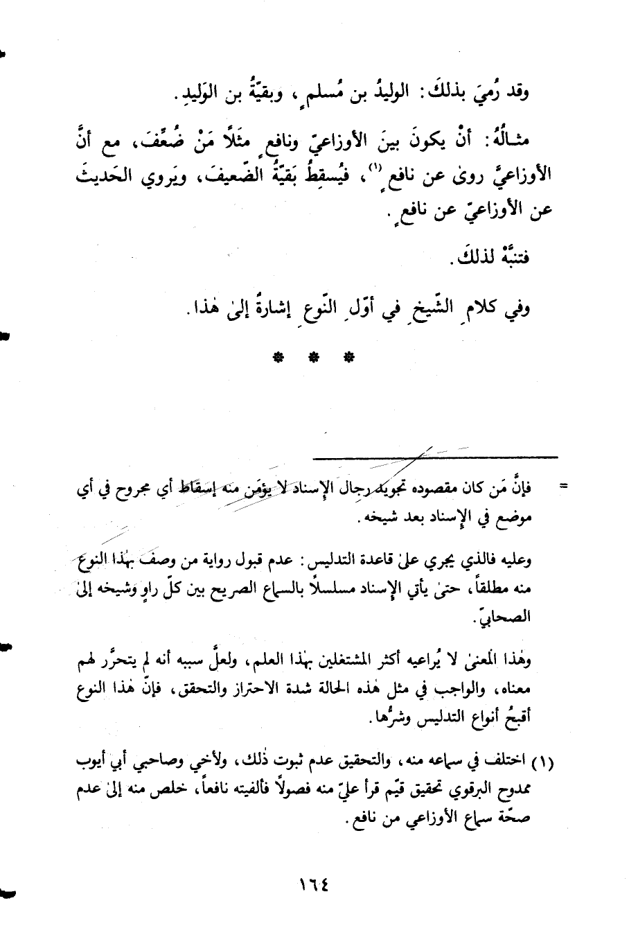 مِثَاله أَن يكون بَين الْأَوْزَاعِيّ 2 وَنَافِع مثلا من ضعف مَعَ أَن الْأَوْزَاعِيّ روى عَن نَافِع فَيسْقط بَقِيَّة الضَّعِيف ويروي الحَدِيث عَن 3 الْأَوْزَاعِيّ عَن نَافِع