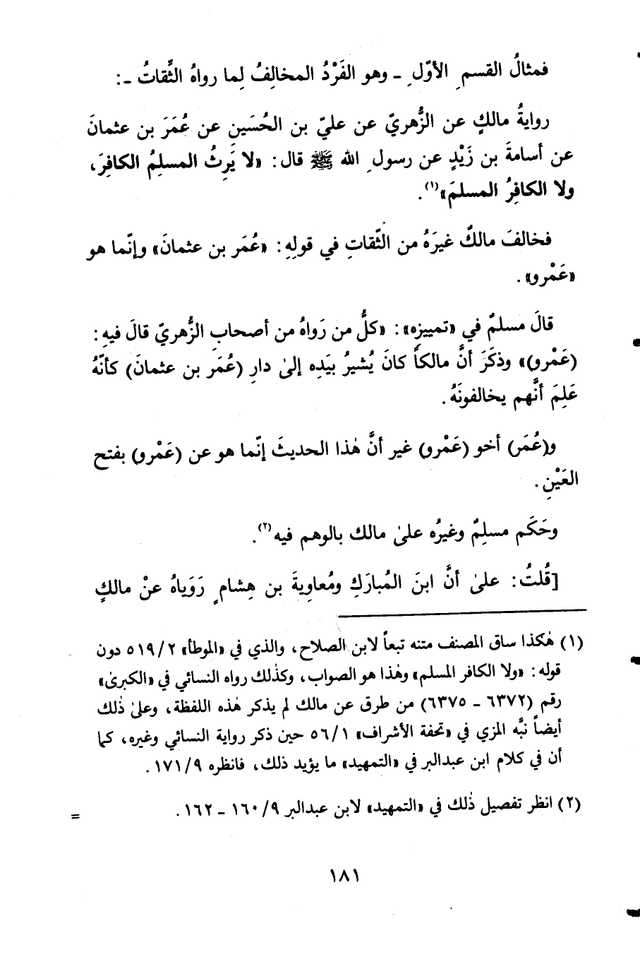 رِوَايَة مَالك عَن الزُّهْرِيّ 2 عَن عَليّ بن الْحُسَيْن عَن عمر بن عُثْمَان عَن أُسَامَة بن زيد عَن رَسُول الله صلى الله عَلَيْهِ وَسلم 3 قَالَ لَا يَرث الْمُسلم الْكَافِر وَلَا الْكَافِر الْمُسلم