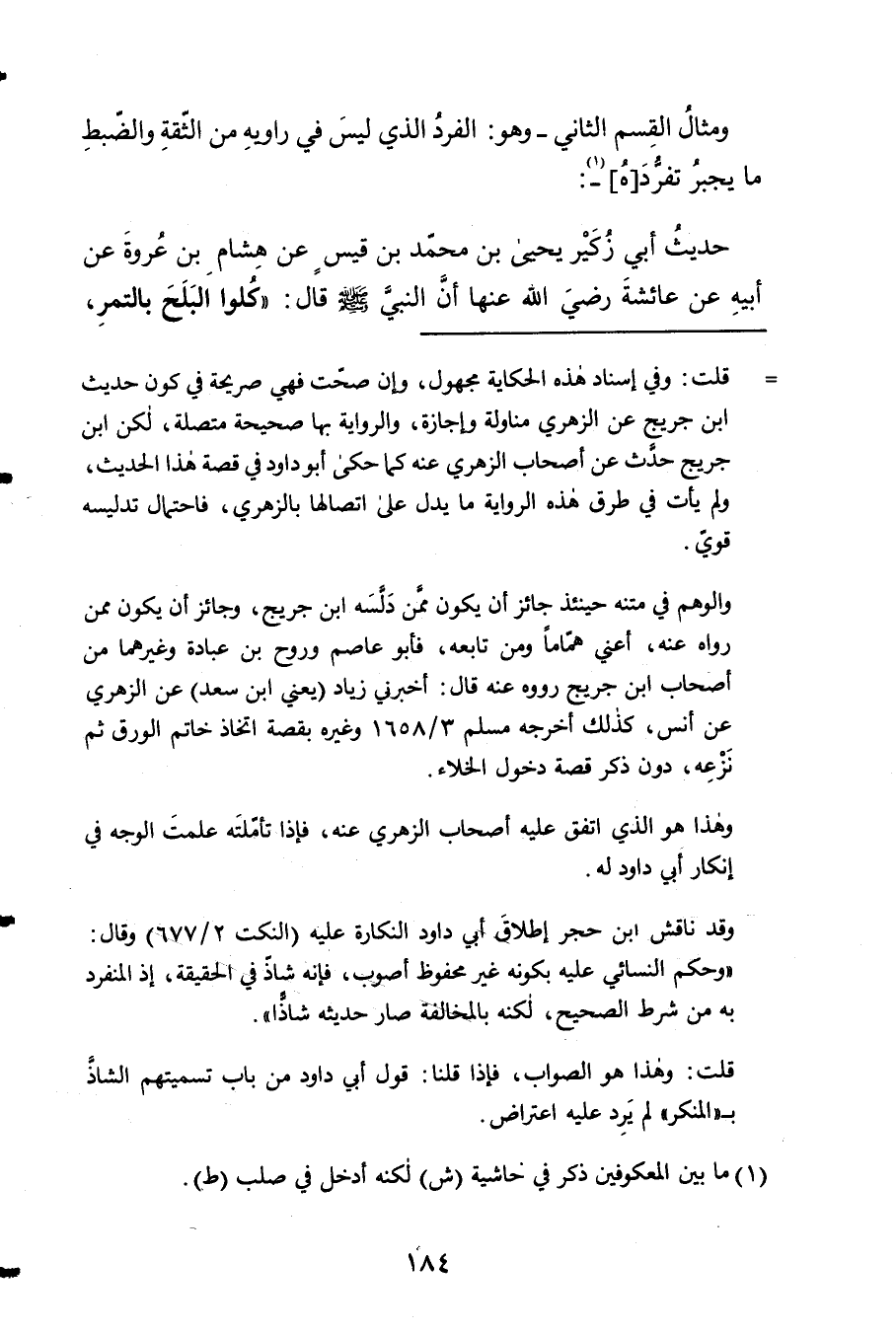 1 - وَمِثَال الْقسم الثَّانِي وَهُوَ الْفَرد الَّذِي لَيْسَ فِي رَاوِيه من الثِّقَة والضبط مَا يجْبر تفرده 2