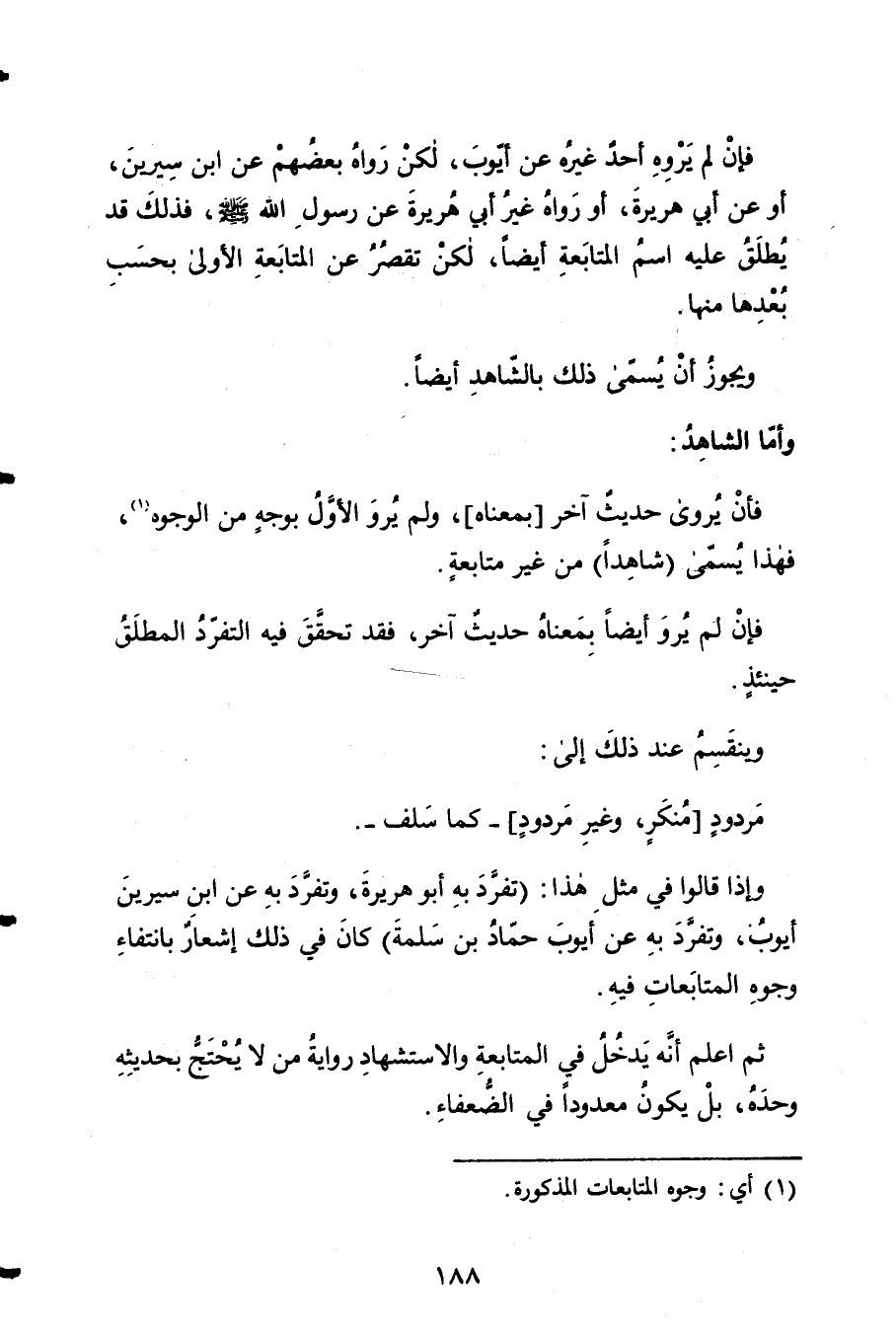 1 - فَإِن لم يروه أحد غَيره عَن أَيُّوب لَكِن رَوَاهُ بَعضهم عَن ابْن سِيرِين أَو عَن أبي هُرَيْرَة 2 أَو رَوَاهُ غير أبي هُرَيْرَة عَن رَسُول الله صلى الله عَلَيْهِ وَسلم فَذَلِك قد يُطلق عَلَيْهِ اسْم الْمُتَابَعَة 3 أَيْضا لَكِن تقصر عَن الْمُتَابَعَة الأولى بِحَسب بعْدهَا مِنْهَا