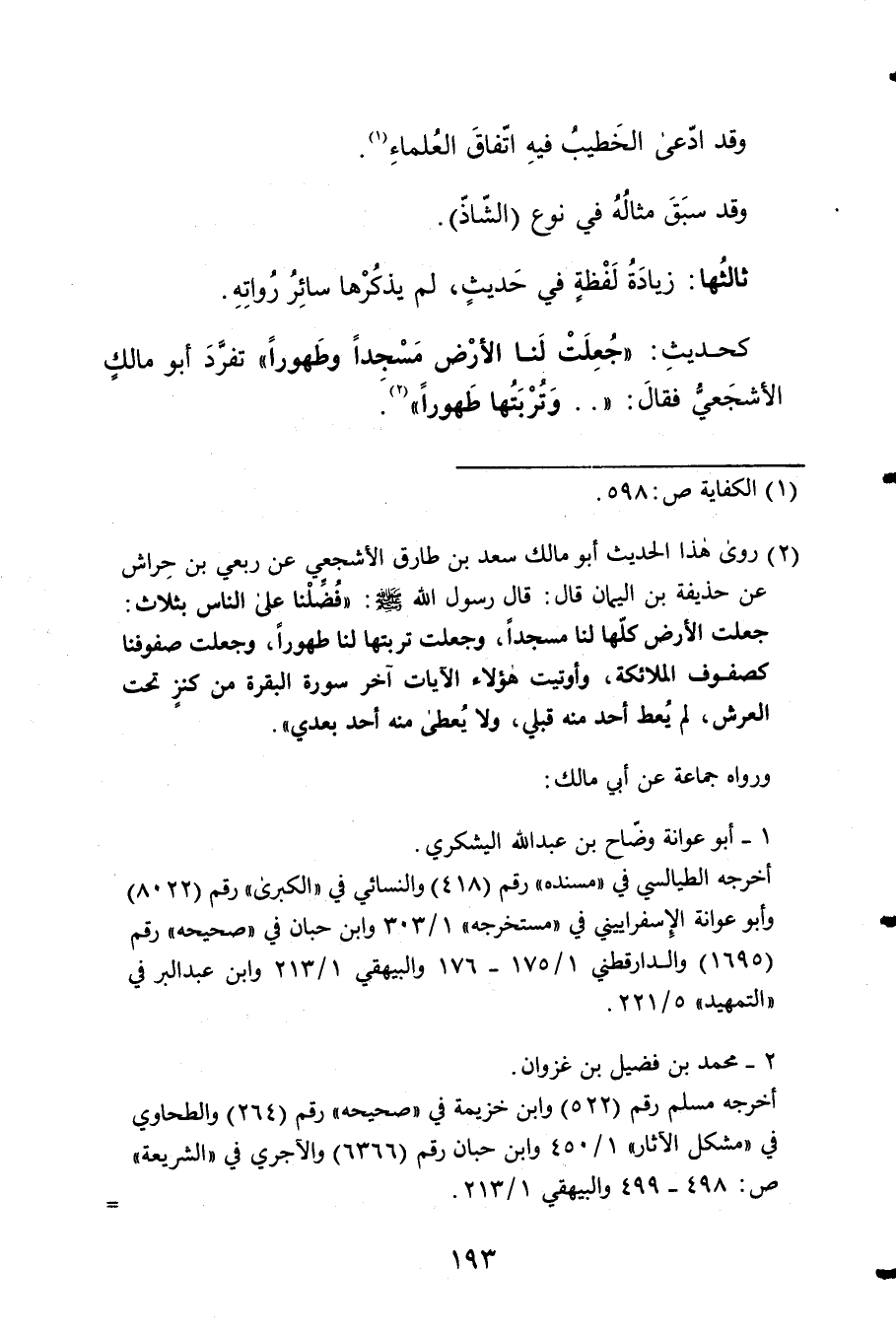 كَحَدِيث جعلت لنا الأَرْض مَسْجِدا طهُورا تفرد أَبُو 3 مَالك الْأَشْجَعِيّ فَقَالَ وتربتها طهُورا