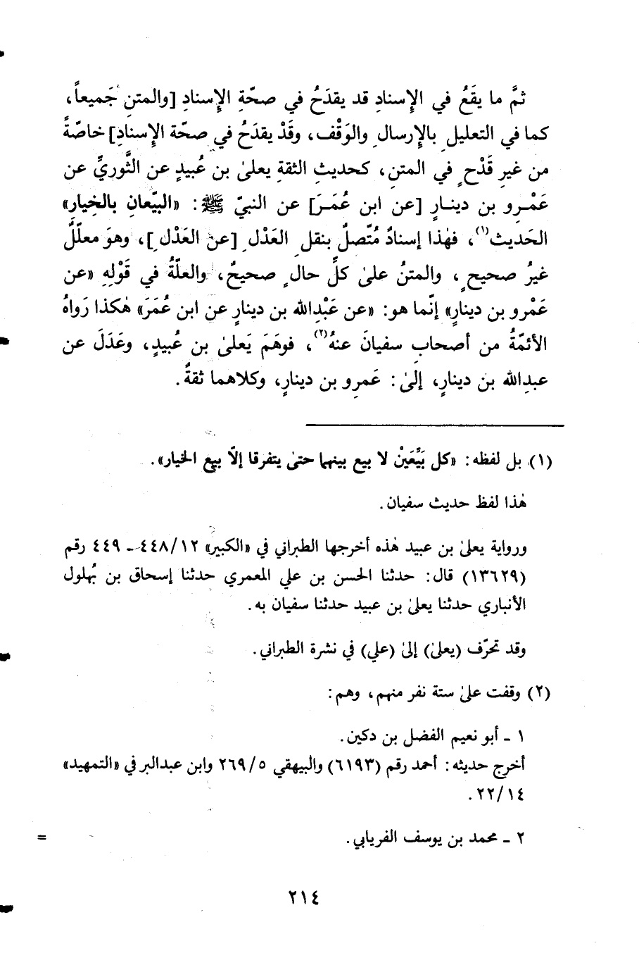 1 - ثمَّ مَا يَقع فِي الْإِسْنَاد قد يقْدَح فِي صِحَة الْإِسْنَاد والمتن جَمِيعًا كَمَا فِي التَّعْلِيل 2 بِالْإِرْسَال وَالْوَقْف وَقد يقْدَح فِي صِحَة الْإِسْنَاد والمتن جَمِيعًا كَمَا فِي التَّعْلِيل بِالْإِرْسَال 3 وَالْوَقْف وَقد يقْدَح فِي صِحَة الْإِسْنَاد خَاصَّة من غير قدح فِي الْمَتْن كَحَدِيث الثِّقَة يعلى بن عبيد 4 عَن الثَّوْريّ عَن عَمْرو بن دِينَار عَن ابْن عمر عَن النَّبِي صلى الله عَلَيْهِ وَسلم البيعان بِالْخِيَارِ 5 الحَدِيث فَهَذَا إِسْنَاد مُتَّصِل بِنَقْل الْعدْل عَن الْعدْل وَهُوَ مُعَلل غير صَحِيح والمتن على كل حَال 6 صَحِيح وَالْعلَّة فِي قَوْله عَن عَمْرو بن دِينَار إِنَّمَا هُوَ عَن عبد الله بن دِينَار عَن ابْن عمر 7 هَكَذَا رَوَاهُ الْأَئِمَّة من أَصْحَاب سُفْيَان عَنهُ فَوَهم يعلى بن عبيد وَعدل عَن عبد الله بن دِينَار 8 إِلَى عَمْرو بن دِينَار وَكِلَاهُمَا ثِقَة