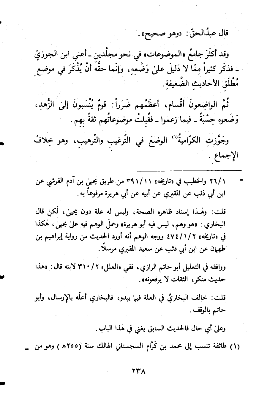 ثمَّ الواضعون أَقسَام أعظمهم ضَرَرا قوم ينسبون إِلَى الزّهْد وضعوه حسبَة فِيمَا زَعَمُوا فَقبلت 4 موضوعاتهم ثِقَة بهم