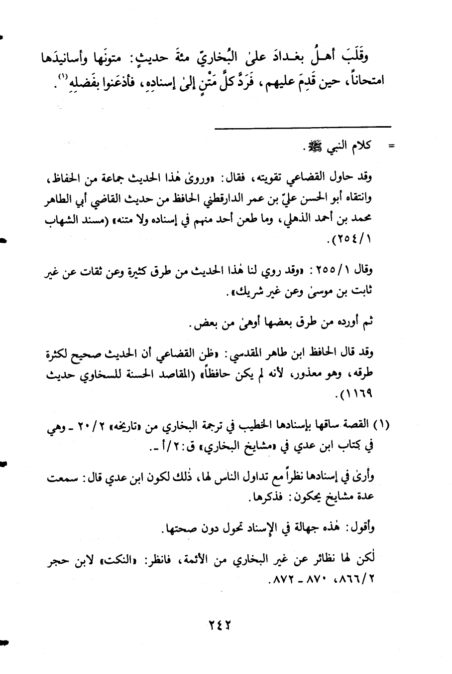 1 - وقلب أهل بَغْدَاد على البُخَارِيّ مئة حَدِيث متونها وأسانيدها امتحانا حِين قدم عَلَيْهِم 2 فَرد كل متن إِلَى إِسْنَاده فأذعنوا بفضله