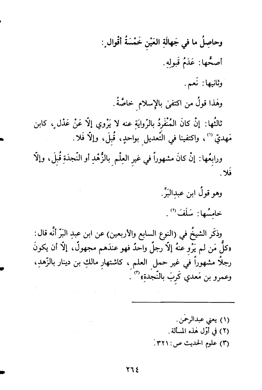 وَذكر 5 الشَّيْخ فِي النَّوْع السَّابِع وَالْأَرْبَعِينَ عَن ابْن عبد الْبر أَنه قَالَ كل من لم يرو عَنهُ إِلَّا 6 رجل وَاحِد فَهُوَ عِنْدهم مَجْهُول إِلَّا أَن يكون رجلا مَشْهُورا فِي غير حمل الْعلم كاشتهار مَالك 7 بن دِينَار بالزهد وَعَمْرو بن معدي كرب بالنجدة