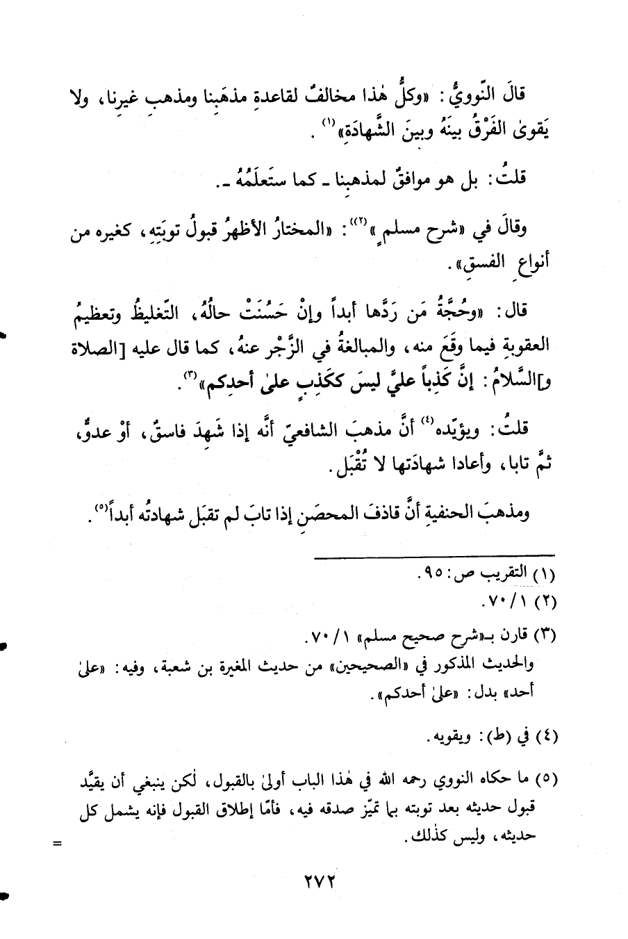 1 - قَالَ النَّوَوِيّ وكل هَذَا مُخَالف لقاعدة مَذْهَبنَا وَمذهب غَيرنَا وَلَا يقوى الْفرق بَينه وَبَين 2 الشَّهَادَة