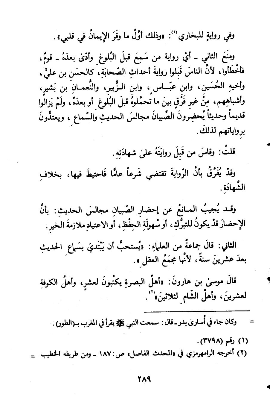 وَمنع الثَّانِي أَي رِوَايَة 2 من سمع قبل الْبلُوغ وَأدّى بعده قوم فأخطأوا لِأَن النَّاس قبلوا رِوَايَة أَحْدَاث الصَّحَابَة كالحسن 3 بن عَليّ وأخيه الْحُسَيْن وَابْن عَبَّاس وَابْن الزبير والنعمان بن بشير وأشباهم من غير فرق 4 من غير فرق بَين مَا تَحملُوهُ قبل الْبلُوغ أَو بعده وَلم يزَالُوا قَدِيما وحديثا يحْضرُون الصّبيان 5 مجَالِس الحَدِيث وَالسَّمَاع ويعتدون برواياتهم لذَلِك