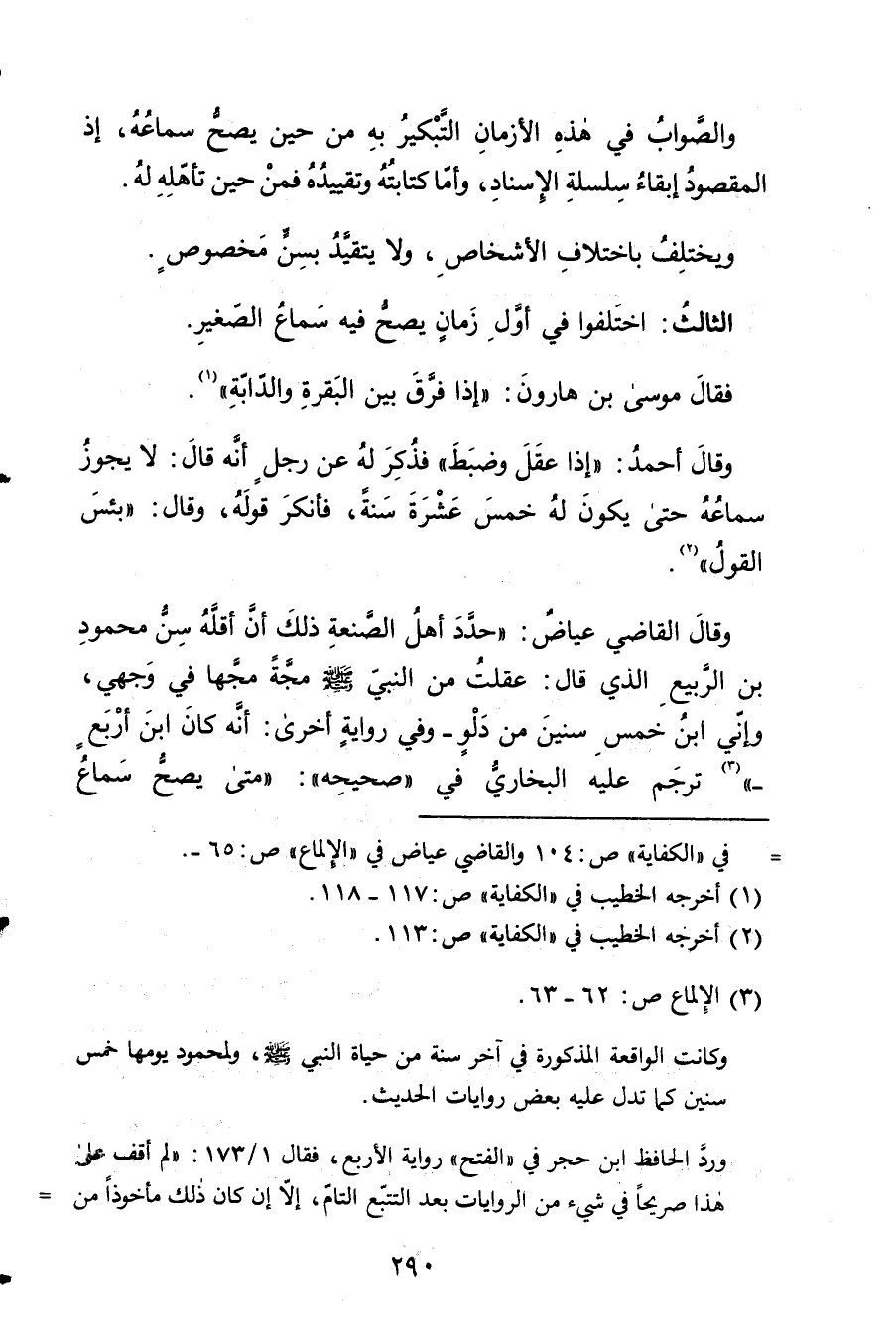وَقَالَ القَاضِي عِيَاض حدد أهل الصَّنْعَة ذَلِك أَن أَقَله سنّ مَحْمُود بن الرّبيع 6 الَّذِي قَالَ عقلت من النَّبِي صلى الله عَلَيْهِ وَسلم مجة مجها فِي وَجْهي وَإِنِّي ابْن خمس سِنِين من دلو وَفِي رِوَايَة 7 أُخْرَى أَنه كَانَ ابْن أَربع تراجم عَلَيْهِ البُخَارِيّ فِي صَحِيحه مَتى يَصح سَماع