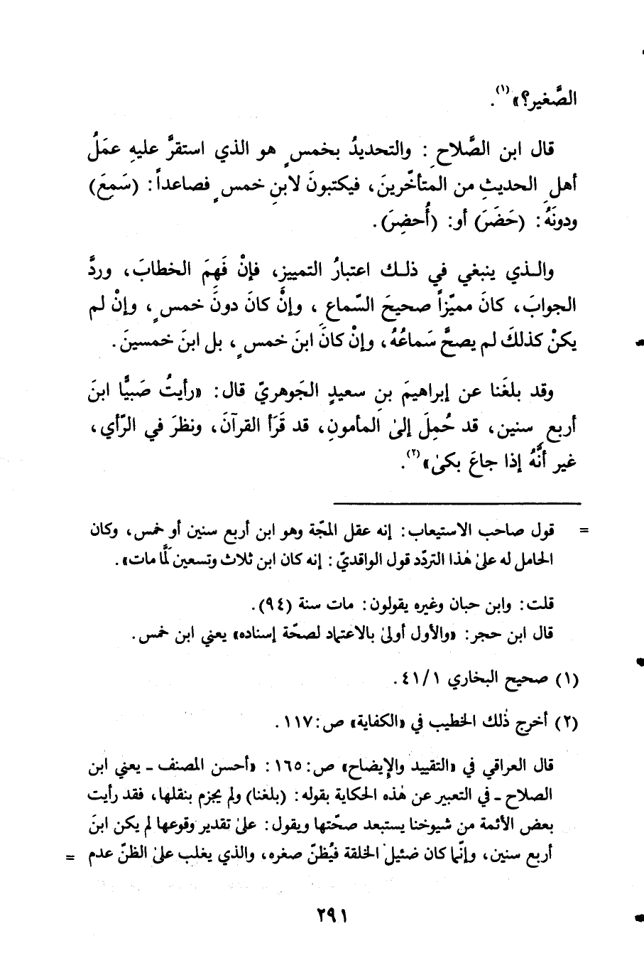 قَالَ ابْن الصّلاح والتحديد بِخمْس هُوَ الَّذِي اسْتَقر عَلَيْهِ عمل أهل الحَدِيث 2 من الْمُتَأَخِّرين فيكتبون لِابْنِ خمس فَصَاعِدا سمع ودونه حضر أَو أحضر