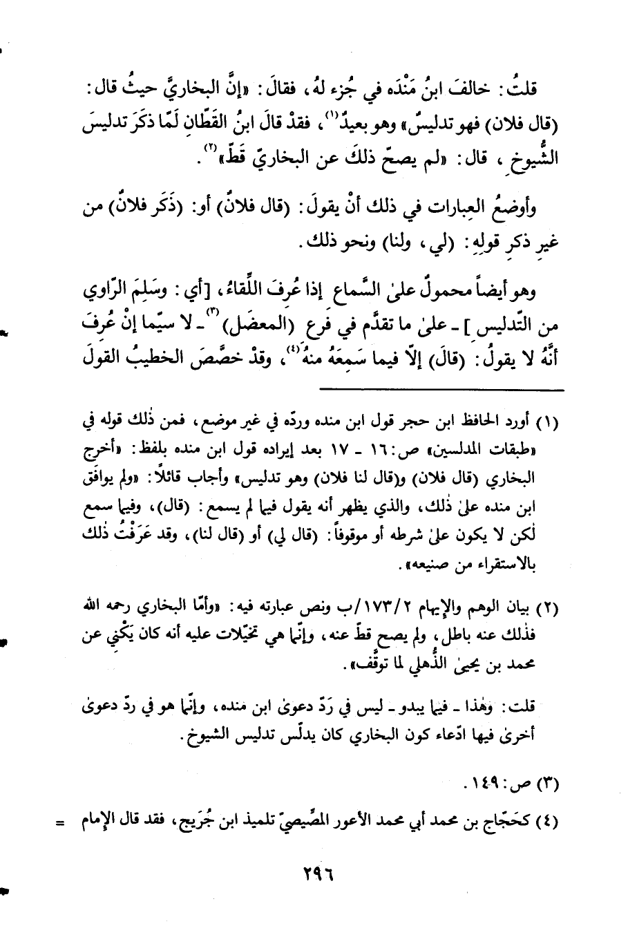 - قلت خَالف ابْن مَنْدَه فِي جُزْء لَهُ فَقَالَ إِن البُخَارِيّ حيق قَالَ قَالَ فلَان فَهُوَ تَدْلِيس 2 وَهُوَ يعبد فقد قَالَ ابْن الْقطَّان لما ذكر تَدْلِيس الشُّيُوخ قَالَ لم يَصح ذَلِك عَن البُخَارِيّ قطّ 3
