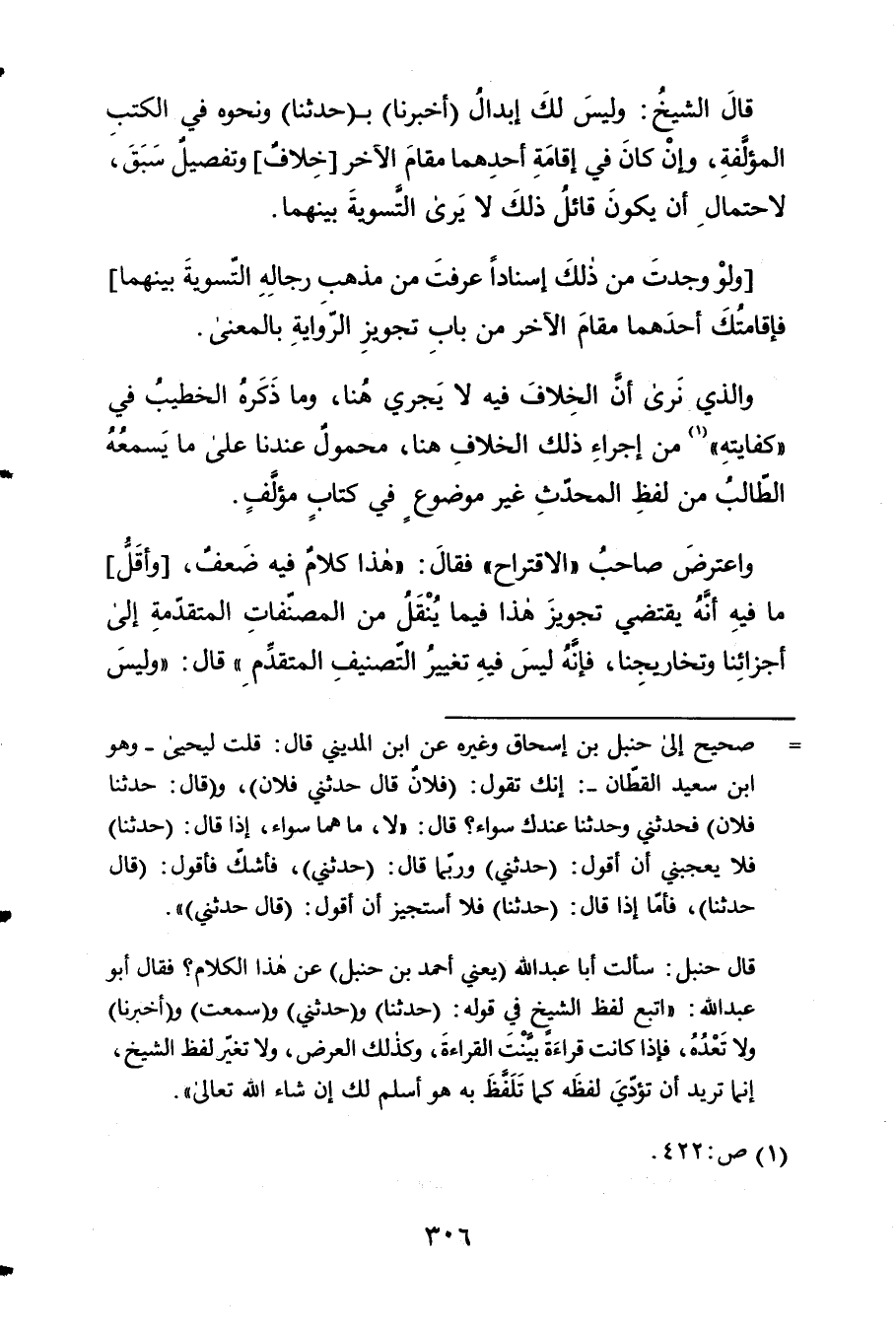 - قَالَ الشَّيْخ وَلَيْسَ لَك إِبْدَال أخبرنَا ب حَدثنَا وَنَحْوه فِي الْكتب الْمُؤَلّفَة وَإِن كَانَ 2 فِي إِقَامَة الآخر خلاف وتفصيل سبق لاحْتِمَال أَن يكون قَائِل ذَلِك لَا يرى التَّسْوِيَة بَينهمَا 3