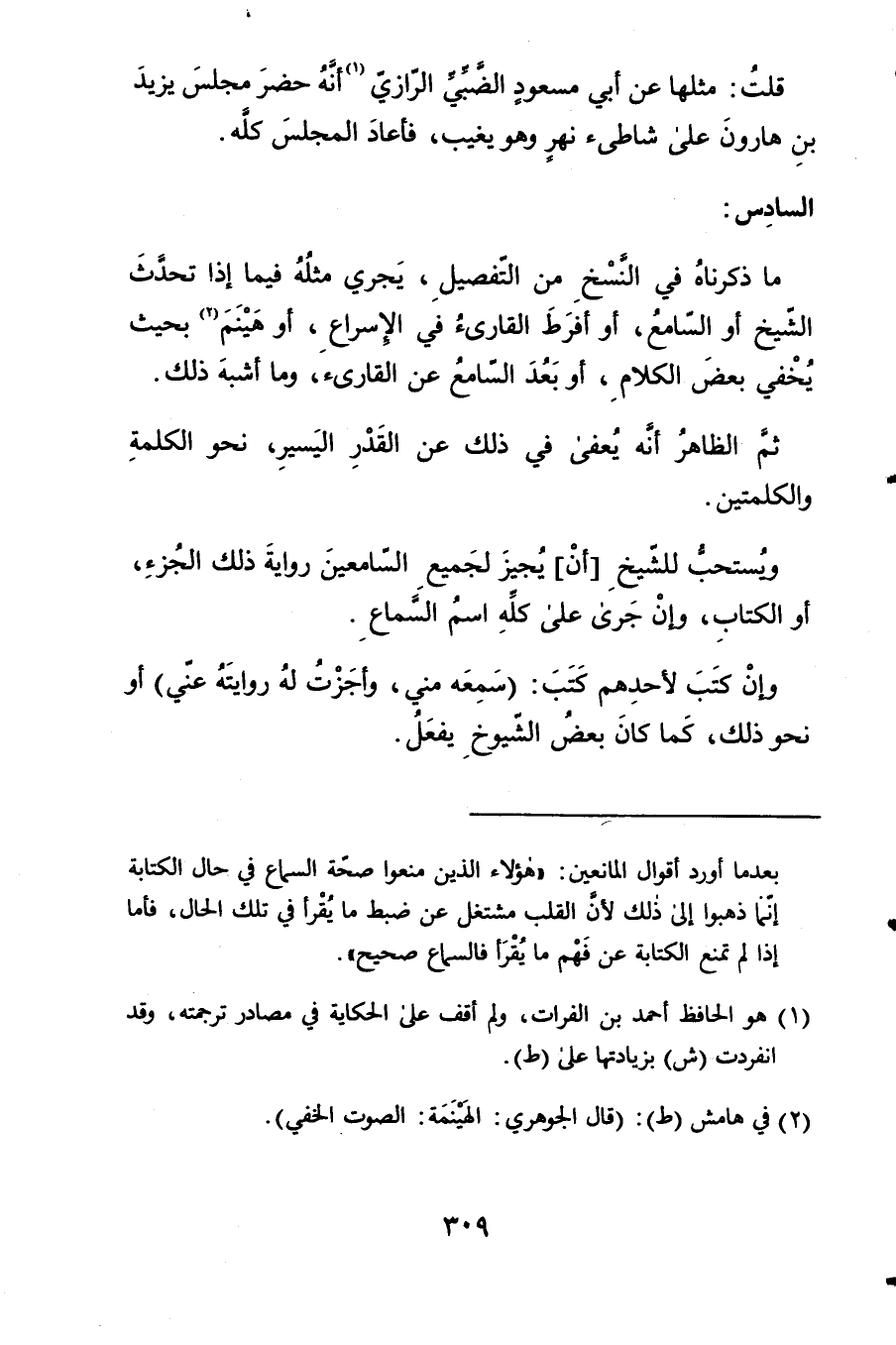 مَا ذَكرْنَاهُ فِي النّسخ من التَّفْصِيل يجْرِي مثله فِيمَا 3 إِذا تحدث الشَّيْخ أَو السَّامع أَو أفراط الْقَارئ فِي الْإِسْرَاع أَو هينم بِحَيْثُ يخفي بعض الْكَلَام 4 أَو بعد السَّامع عَن الْقَارئ وَمَا أشبه ذَلِك