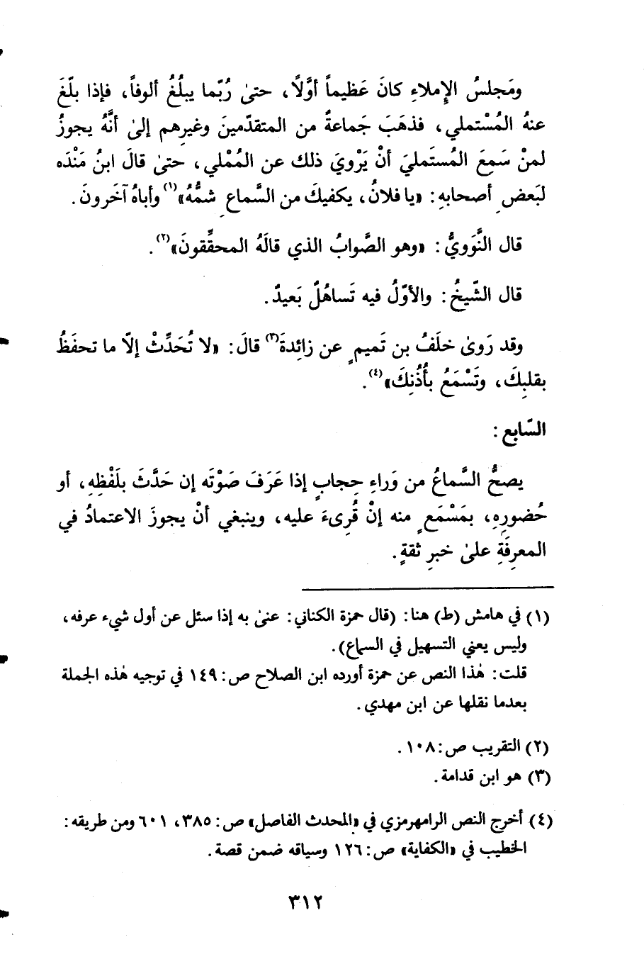 يَصح السماع 6 من وَرَاء حجاب إِذا عرف صَوته إِن حدث بِلَفْظِهِ أَو حُضُوره بمسمع مِنْهُ إِن قرئَ عَلَيْهِ وَيَنْبَغِي 7 أَن يجوز الِاعْتِمَاد فِي الْمعرفَة على خبر ثِقَة