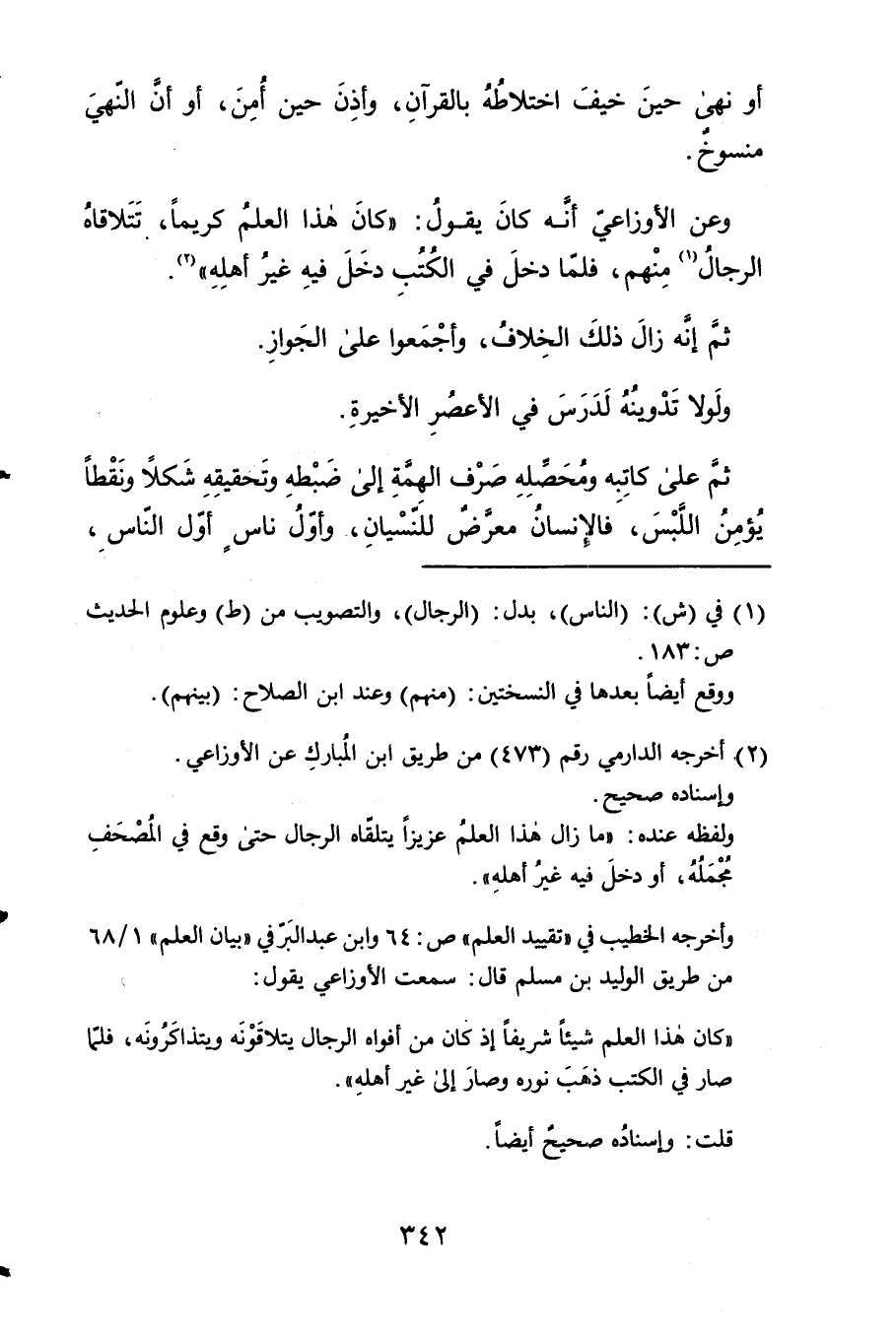 - وَعَن الْأَوْزَاعِيّ أَنه كَانَ يَقُول: كَانَ هَذَا الْعلم كَرِيمًا، تتلاقاه الرِّجَال مِنْهُم، 2 فَلَمَّا دخل فِي الْكتب دخل فِيهِ غير أَهله.