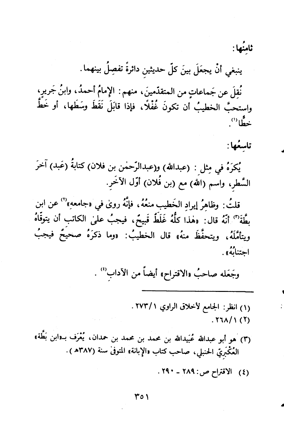 قلت: وَظَاهر إِيرَاد 5 الْخَطِيب مَنعه، فَإِنَّهُ روى فِي جَامِعَة عَن ابْن بطة أَنه قَالَ: هَذَا كُله غلط قَبِيح، فَيجب على 6 الْكَاتِب أَن يتوقاه ويتأمله، ويتحفظ مِنْهُ قَالَ الْخَطِيب: وَمَا ذكره صَحِيح فَيجب اجتنابه. 7