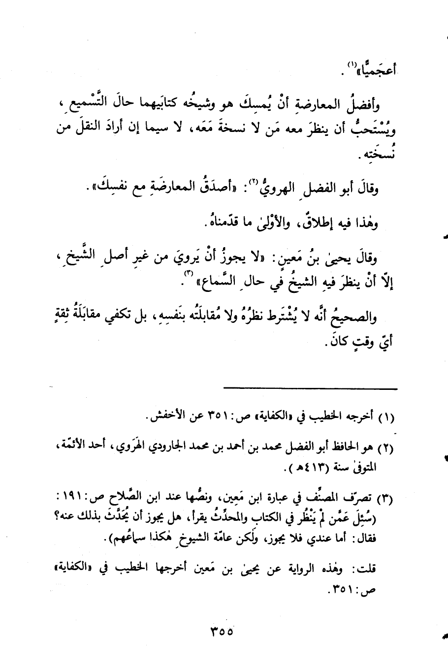 وَقَالَ 4 يحيى بن معِين: لَا يجوز أَن يروي من غير أصل الشَّيْخ، إِلَّا أَن ينظر فِيهِ الشَّيْخ فِي حَال 5 السماع.