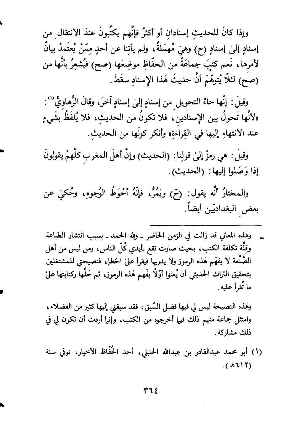 - وَإِذا كَانَ للْحَدِيث إسنادان أَو أَكثر فَإِنَّهُم يَكْتُبُونَ عِنْد الِانْتِقَال من إِسْنَاد إِلَى 2 إِسْنَاد (ح) وَهِي مُهْملَة، وَلم يأتنا عَن أحد مِمَّن يعْتَمد بَيَان لأمرها، نعم كتب جمَاعَة من 3 الْحفاظ موضها (صَحَّ) فيشعر بِأَنَّهَا من (صَحَّ) لِئَلَّا يتَوَهَّم أَن حَدِيث هَذَا الأسناد سقط.