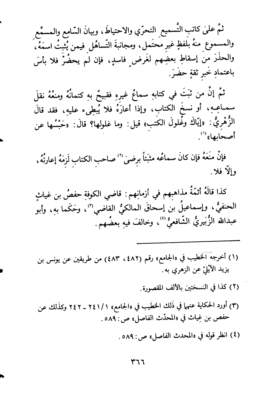 ثمَّ إِن من ثَبت فِي كِتَابه سَماع غَيره فقبيح 4 بِهِ كِتْمَانه وَمنعه نقل سَمَاعه، أَو نسخ الْكتاب، وَإِذا أَعَارَهُ فَلَا يبطىء عَلَيْهِ، فقد قَالَ 5 الزُّهْرِيّ: إياك وَغُلُول الْكتب قيل: وَمَا غلولها قَالَ: حَبسهَا عَن أَصْحَابهَا.