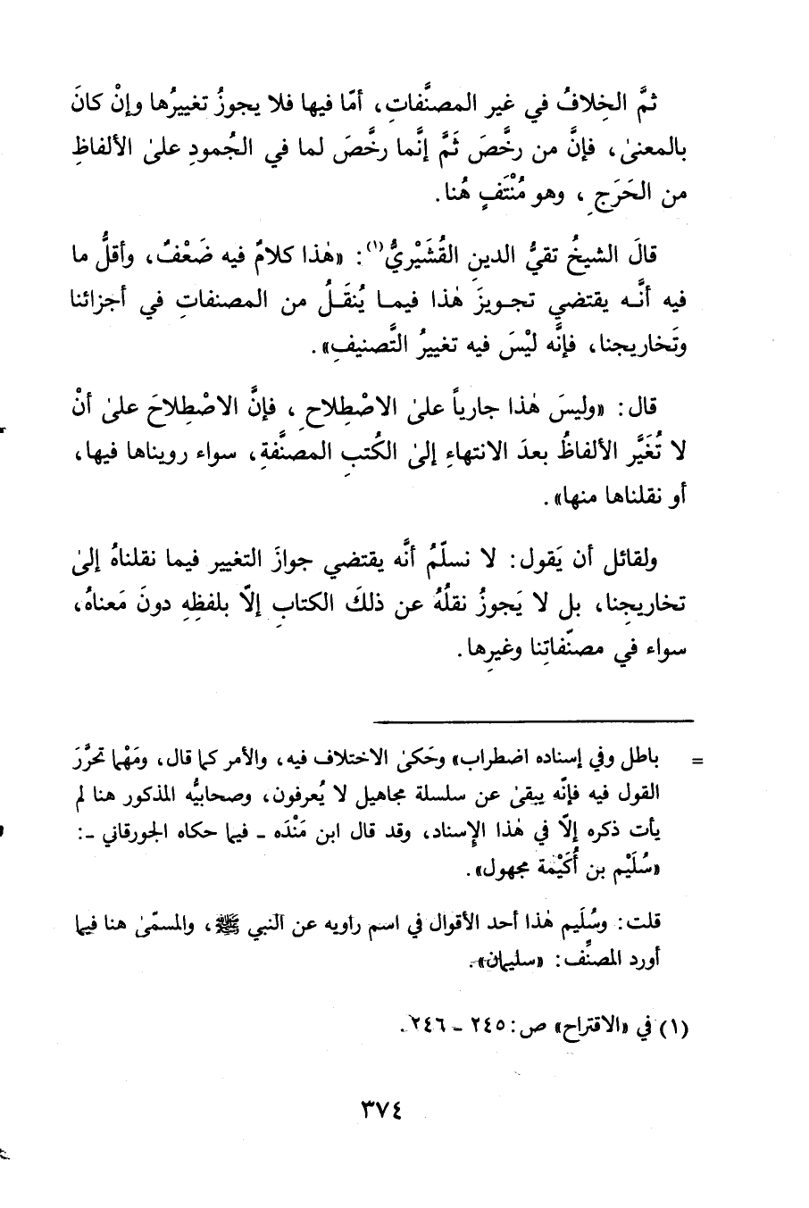 قَالَ الشَّيْخ 3 تَقِيّ الدّين الْقشيرِي هَذَا كَلَام فِيهِ ضعف وَأَقل مَا فِيهِ أَنه يَقْتَضِي تَجْوِيز هَذَا فِيمَا ينْقل 4 من المصنفات فِي أجرائنا وتخاريجنا فَإِنَّهُ لَيْسَ فِيهِ تَغْيِير التصنيف