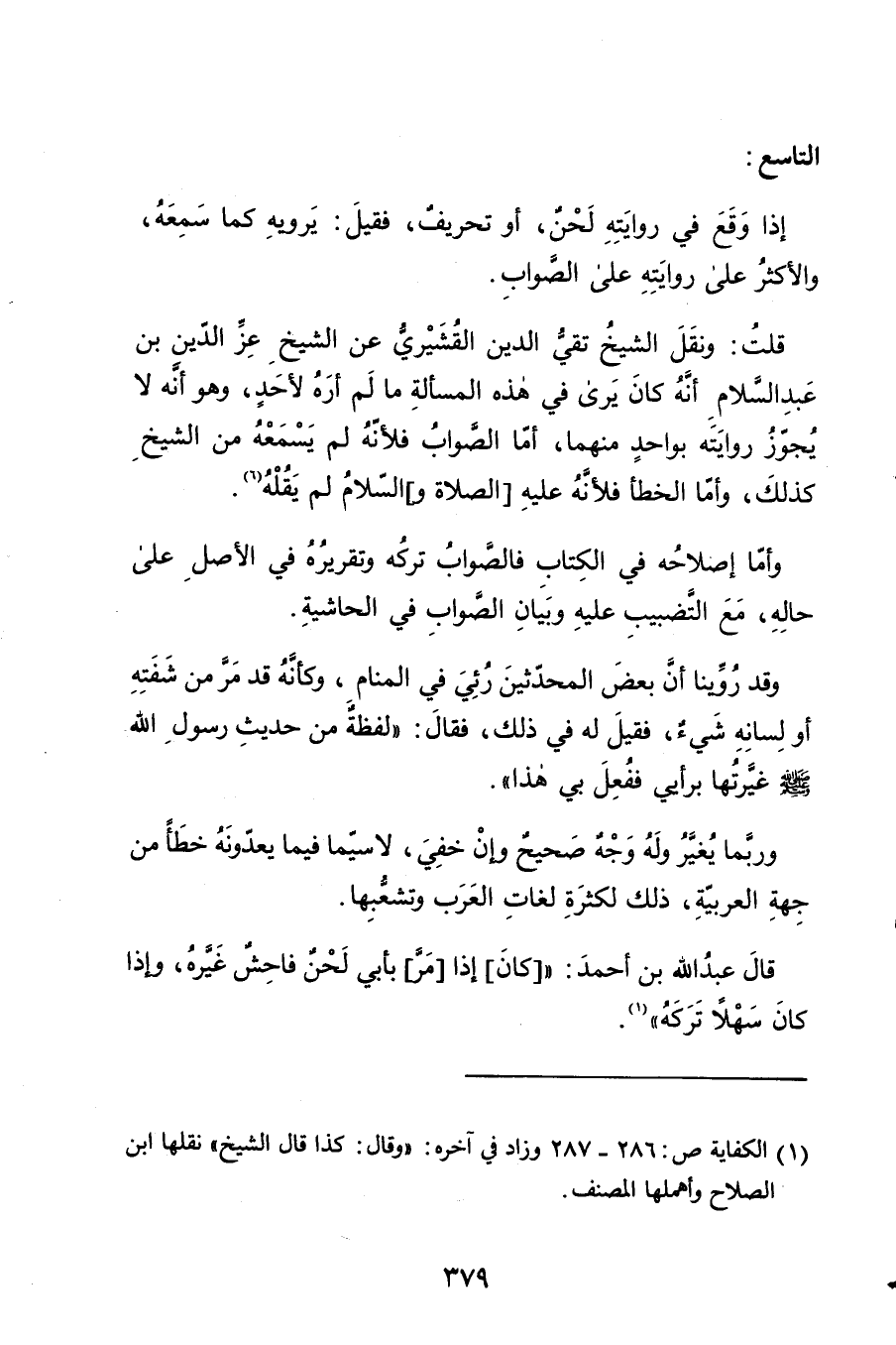 إِذا وَقع فِي رِوَايَته لحن أَو تَحْرِيف فَقيل يرويهِ كَمَا سَمعه وَالْأَكْثَر على 2 رِوَايَته على الصَّوَاب
