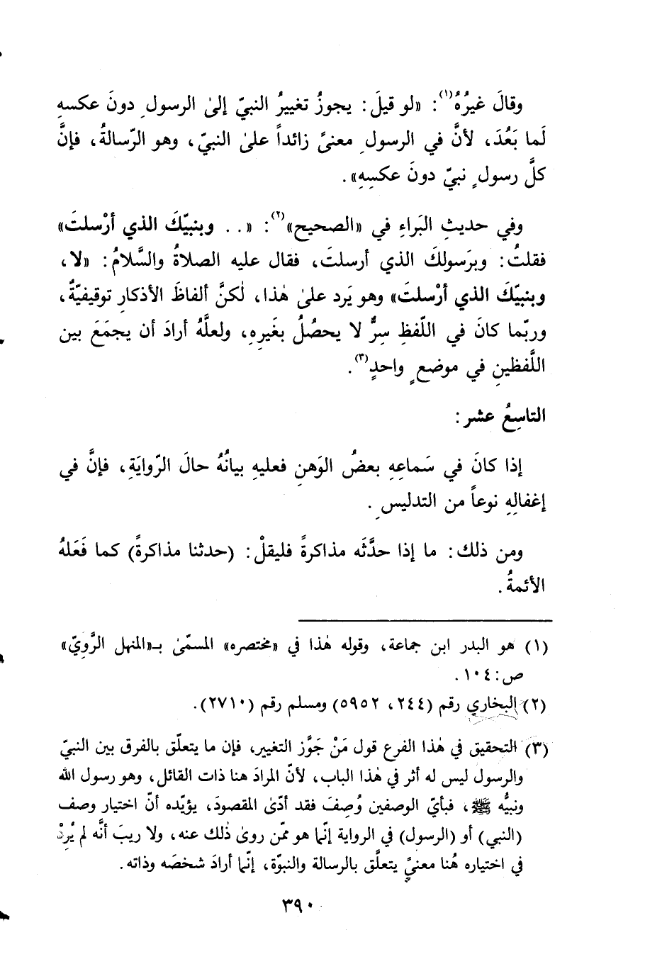 1 - وَقَالَ غَيره لَو قيل يجوز تَغْيِير النَّبِي إِلَى الرَّسُول دون عَكسه لما بعد لِأَن فِي الرَّسُول 2 معنى زَائِدا على النَّبِي وَهُوَ الرسَالَة فَإِن كل رَسُول نَبِي دون عَكسه
