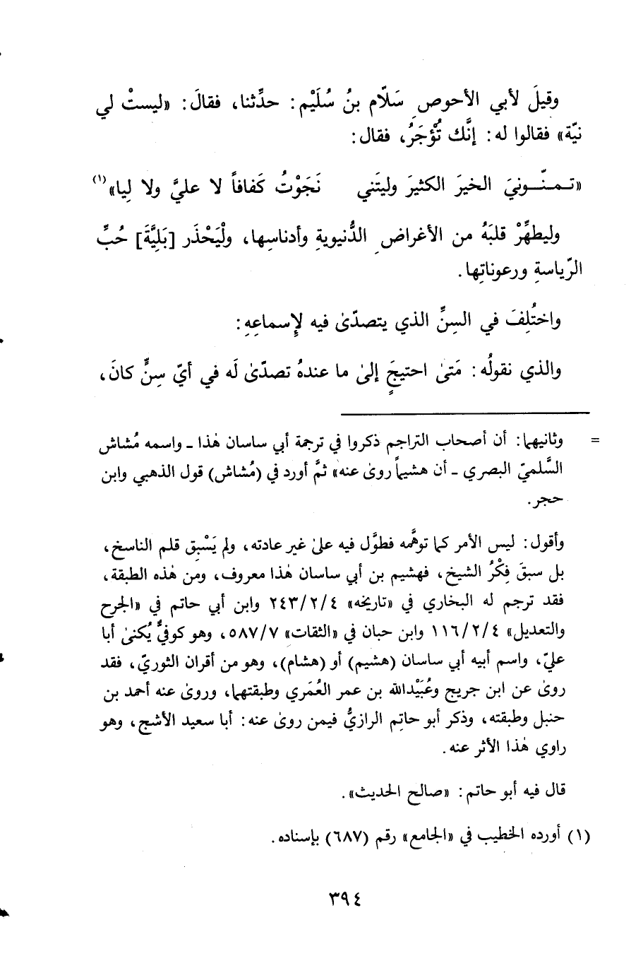 1 - وَقيل لأبي الْأَحْوَص سَلام بن سليم حَدثنَا فَقَالَ لَيست لي نِيَّة فَقَالُوا لَهُ إِنَّك تؤجر 2 فَقَالَ ... تمنوني الْخَيْر الْكثير وليتني ... نجوت كفافا لَا عَليّ وَلَا ليا ...