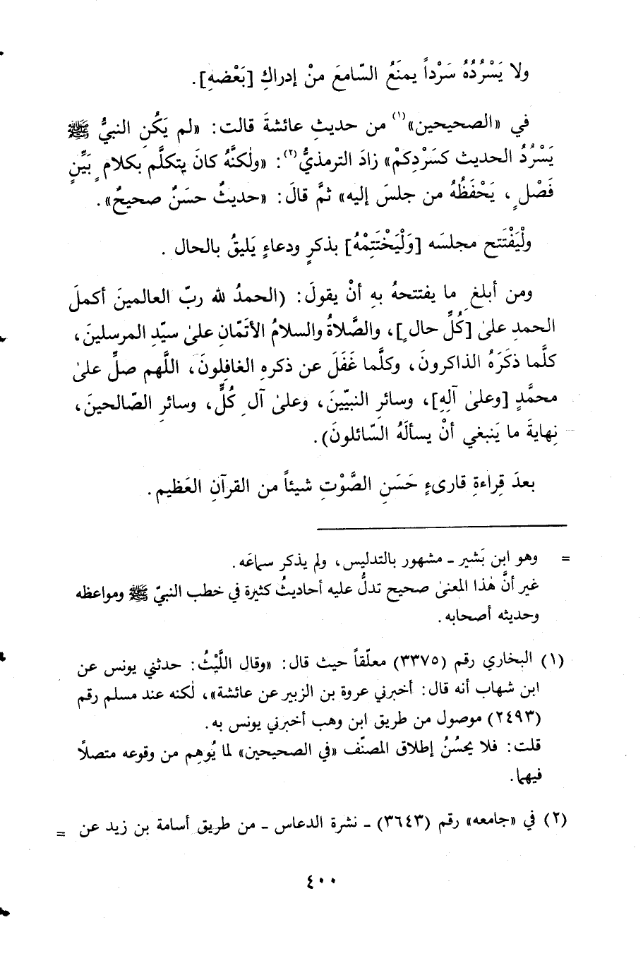 فِي الصَّحِيحَيْنِ من حَدِيث عَائِشَة قَالَت 2 لم يكن النَّبِي صلى الله عَلَيْهِ وَسلم يسْرد الحَدِيث كَسَرْدِكُمْ زَاد التِّرْمِذِيّ وَلكنه كَانَ يتَكَلَّم 3 بِكَلَام بَين فصل يحفظه من جلس إِلَيْهِ ثمَّ قَالَ حَدِيث حسن صَحِيح