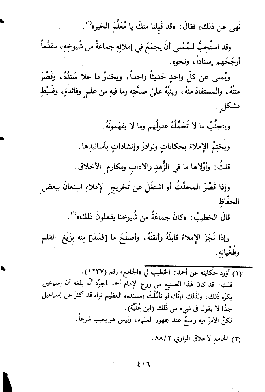 ويملي عَن كل وَاحِد حَدِيثا وَاحِدًا 3 ويختار مَا علا سَنَده وَقصر مَتنه والمستفاد مِنْهُ وينبه على صِحَّته وَمَا فِيهِ من علم وَفَائِدَة 4 وَضبط مُشكل